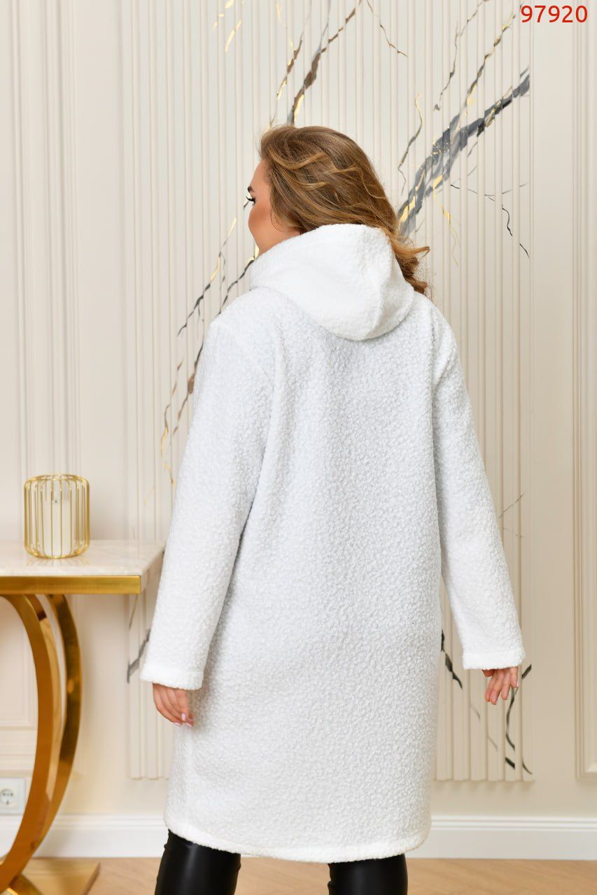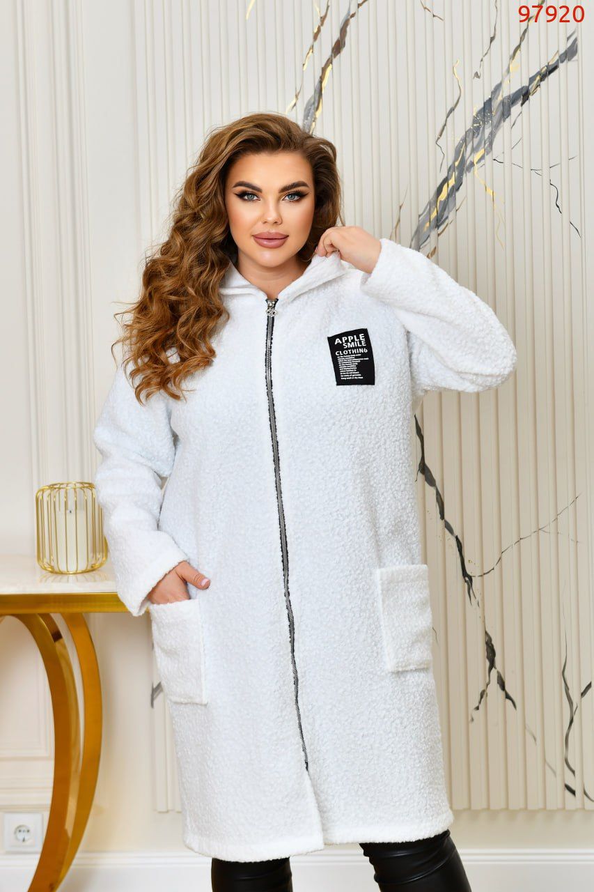 Неймовірно стильний кардиган з капюшоном, із буклє «баранець» ( розтяжність мінімальна). Силует прямий, вільний. Застібається на блискавку. Попереду оброблені дві накладні кишені. Кардиган декорований якісною нашивкою. Підкладу немає.