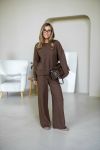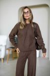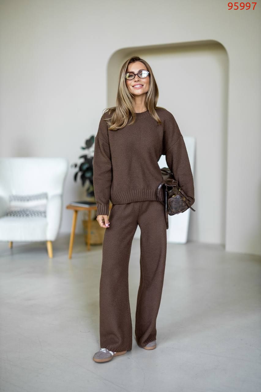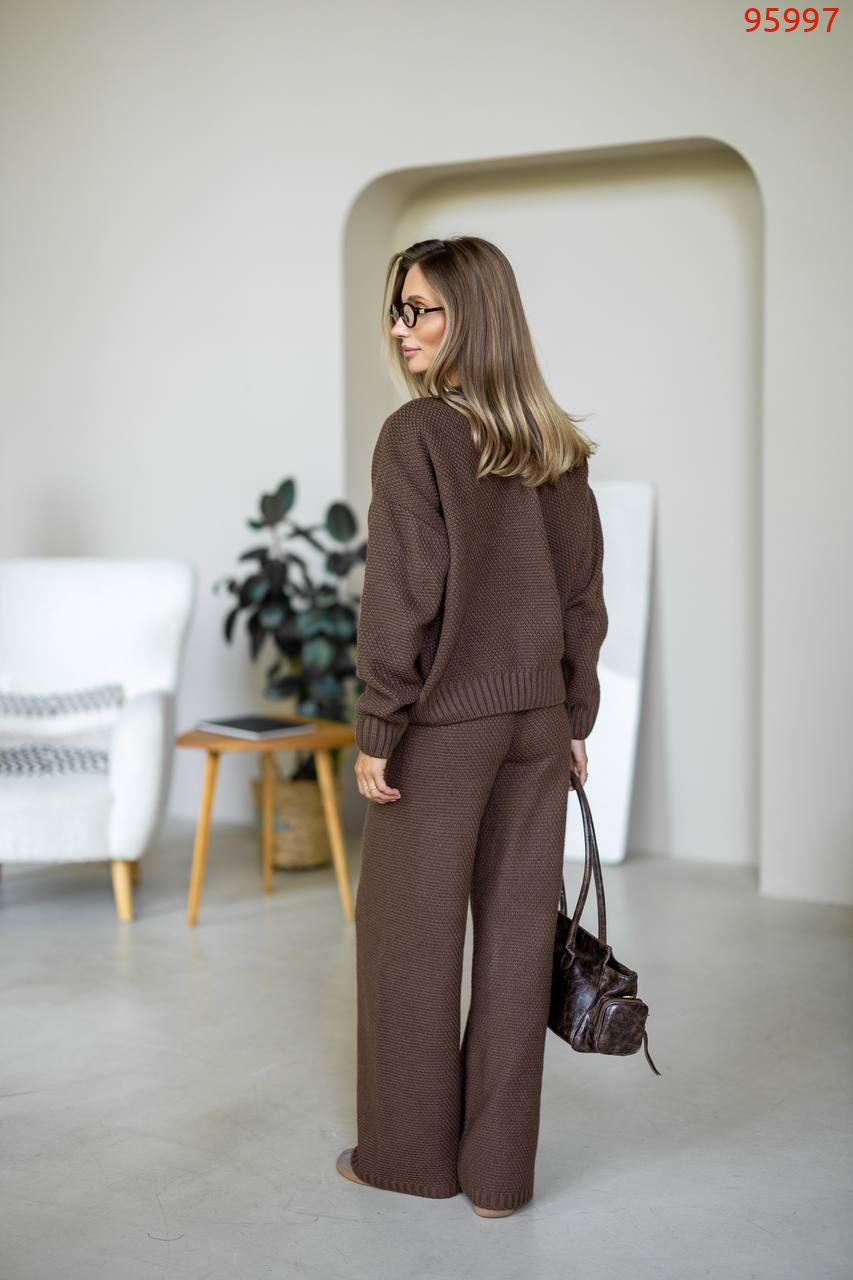 Затишний костюм із щільної фактурної в'язки з м'яким приляганням до тіла. Вільний светр та прямі штани створюють елегантний, розслаблений образ щодня.