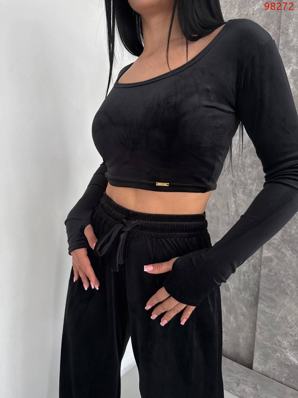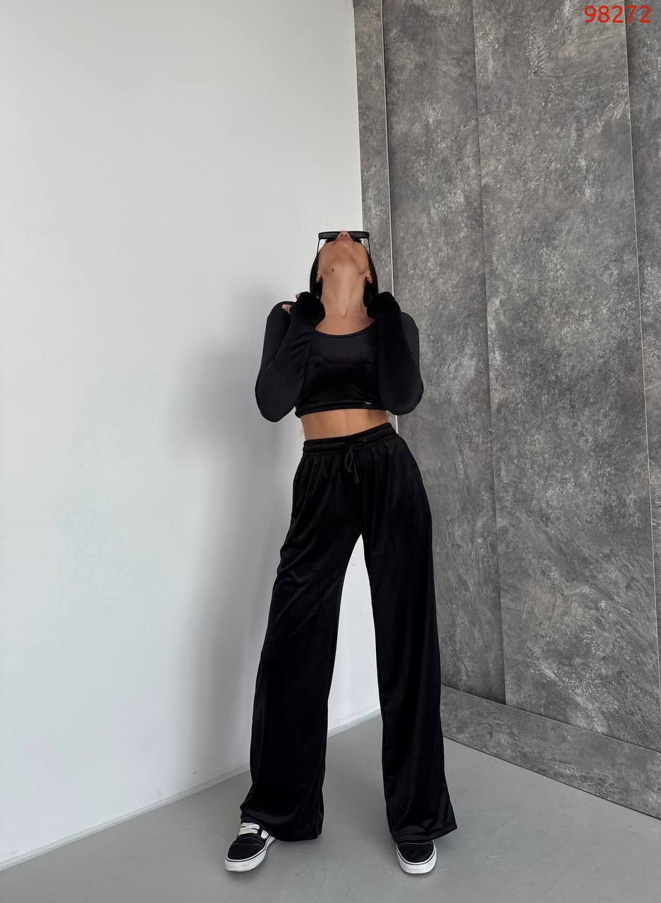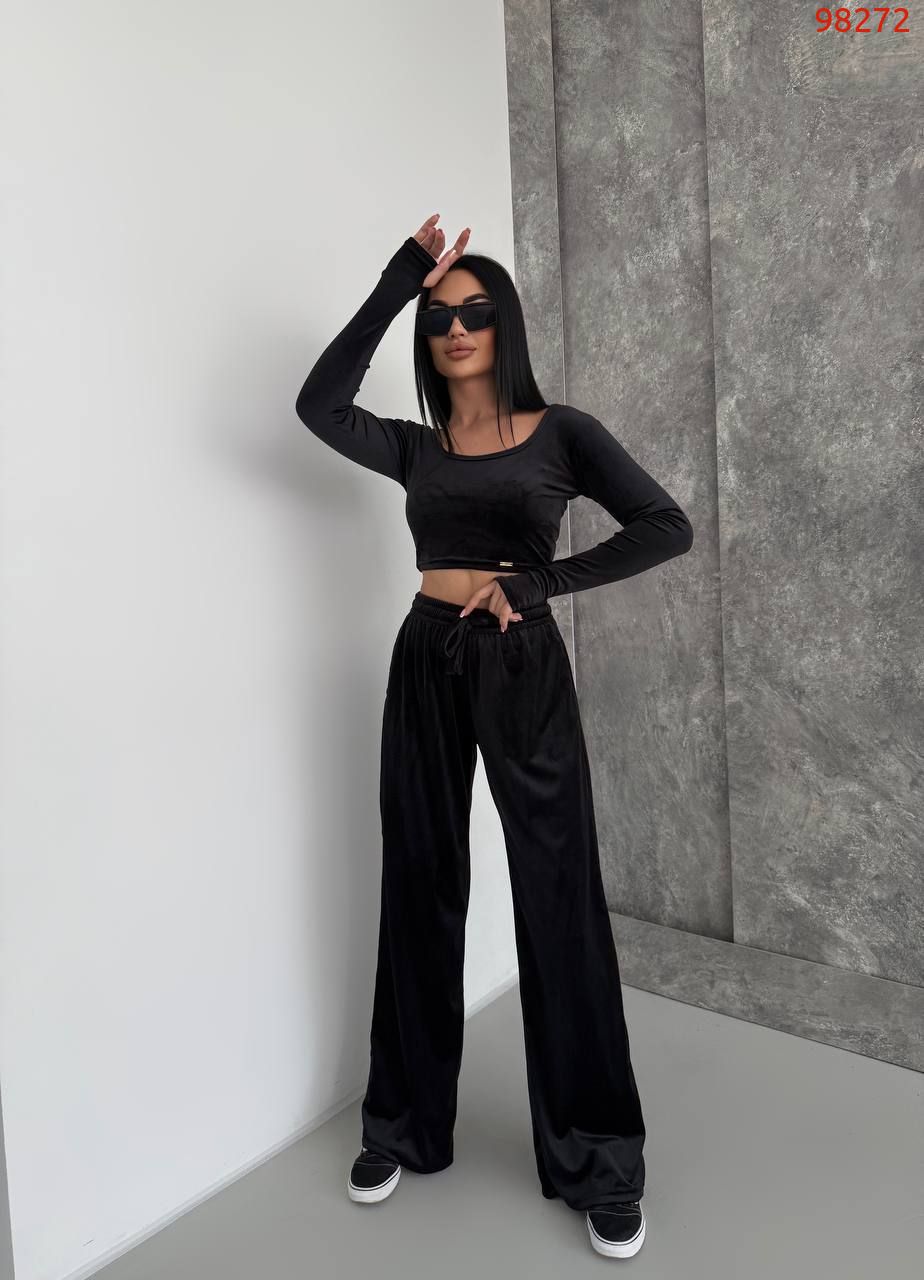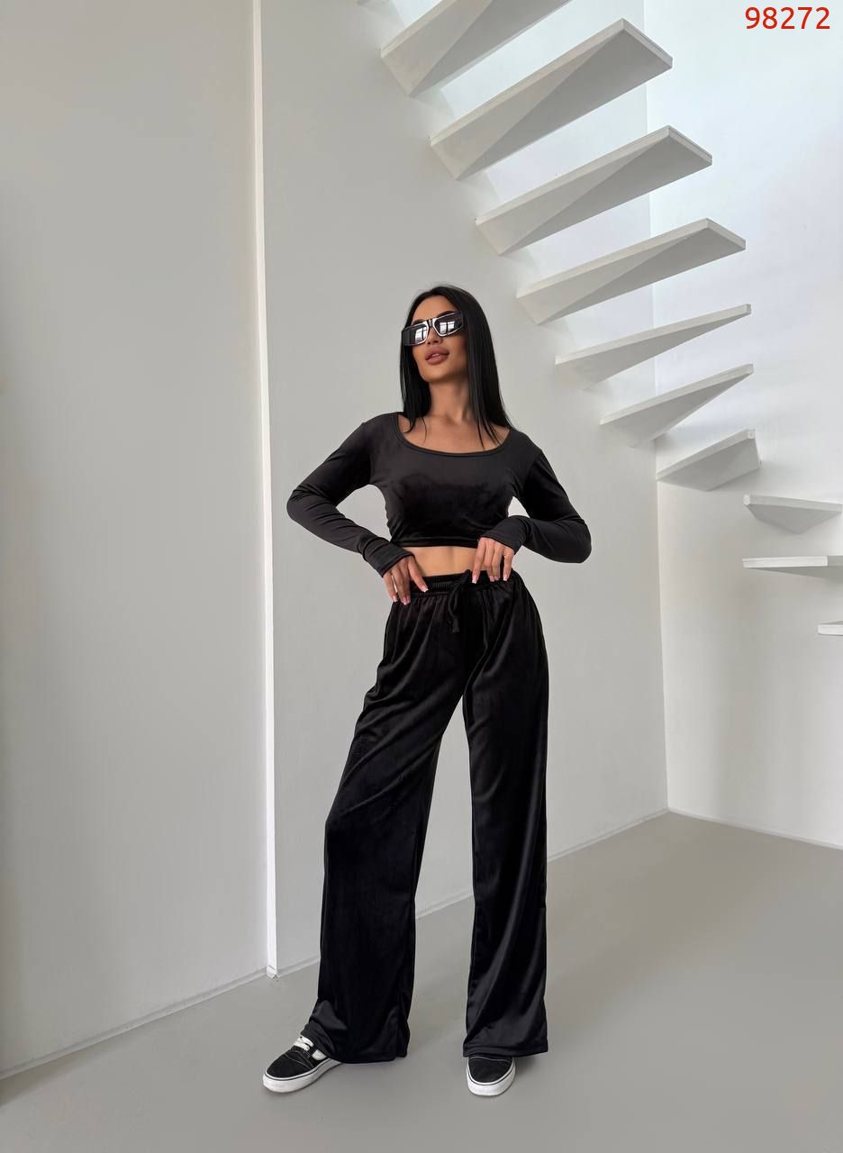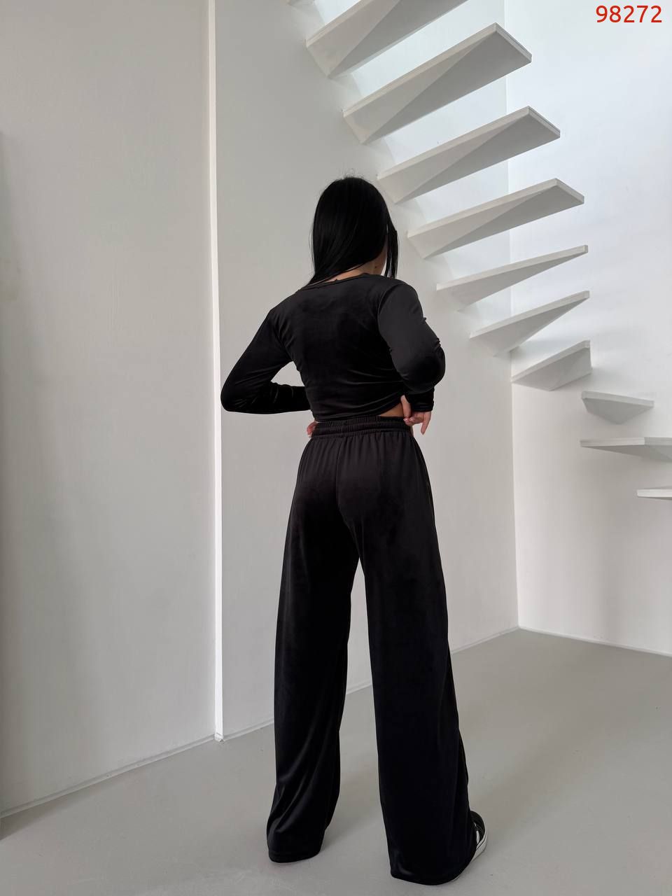 Стильний практичний костюмчик з велюру. Приємна мʼяка тканина, тягнеться. На костюмі є пришивна, як на фото. Також лонг йде з розрізом на пальчику. Штани йдуть вільні, на резинці в талії та шнурочком.