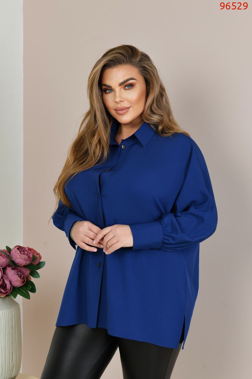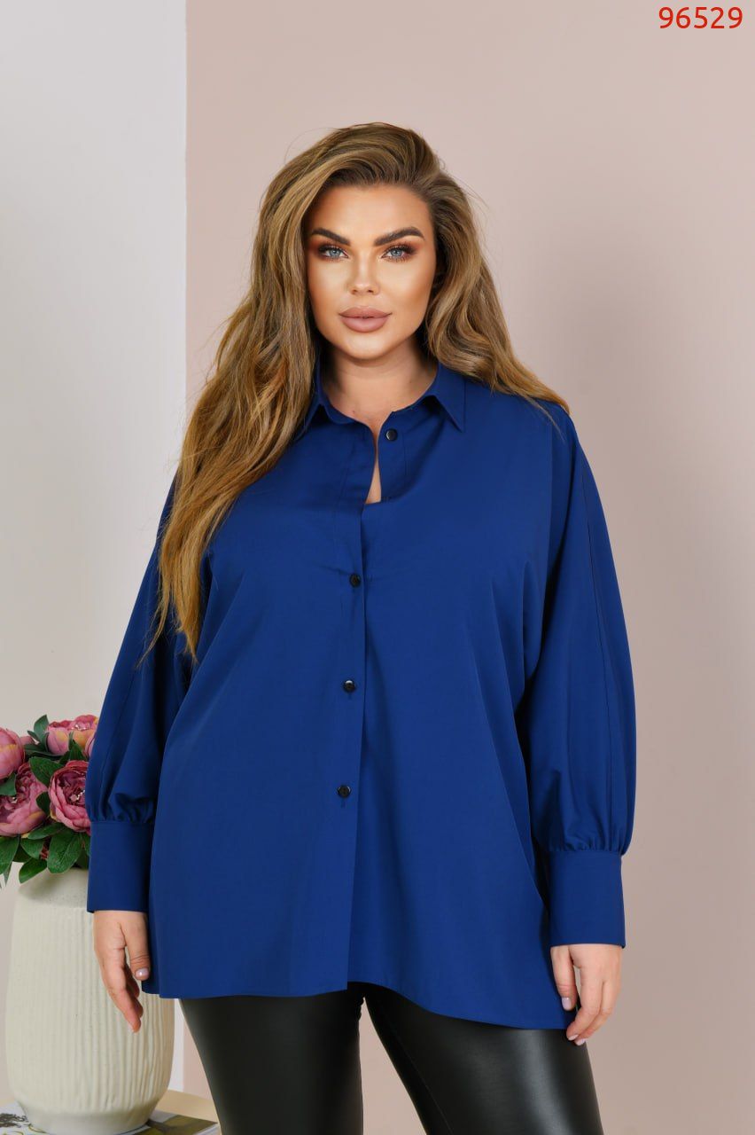 Блузка має прямий вільний та подовжений силует, рукав довгий цільнокроєний, на високому манжеті з гудзиком. Комірець зі стікою. Застібається блузка на гудзики по передній планці.