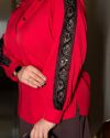 Блуза прямого вільного силуету, зі стояче-відкладеним комірцем. Рукав-реглан, досить широкий, зібраний на манжет із гудзиком, декорований дуже гарним та якісним мереживом, що додає жіночності та стилю цьому виробу. Застібається блуза на гудзики, розташовані по передній планці. Внизу з боків невеликі розрізи.