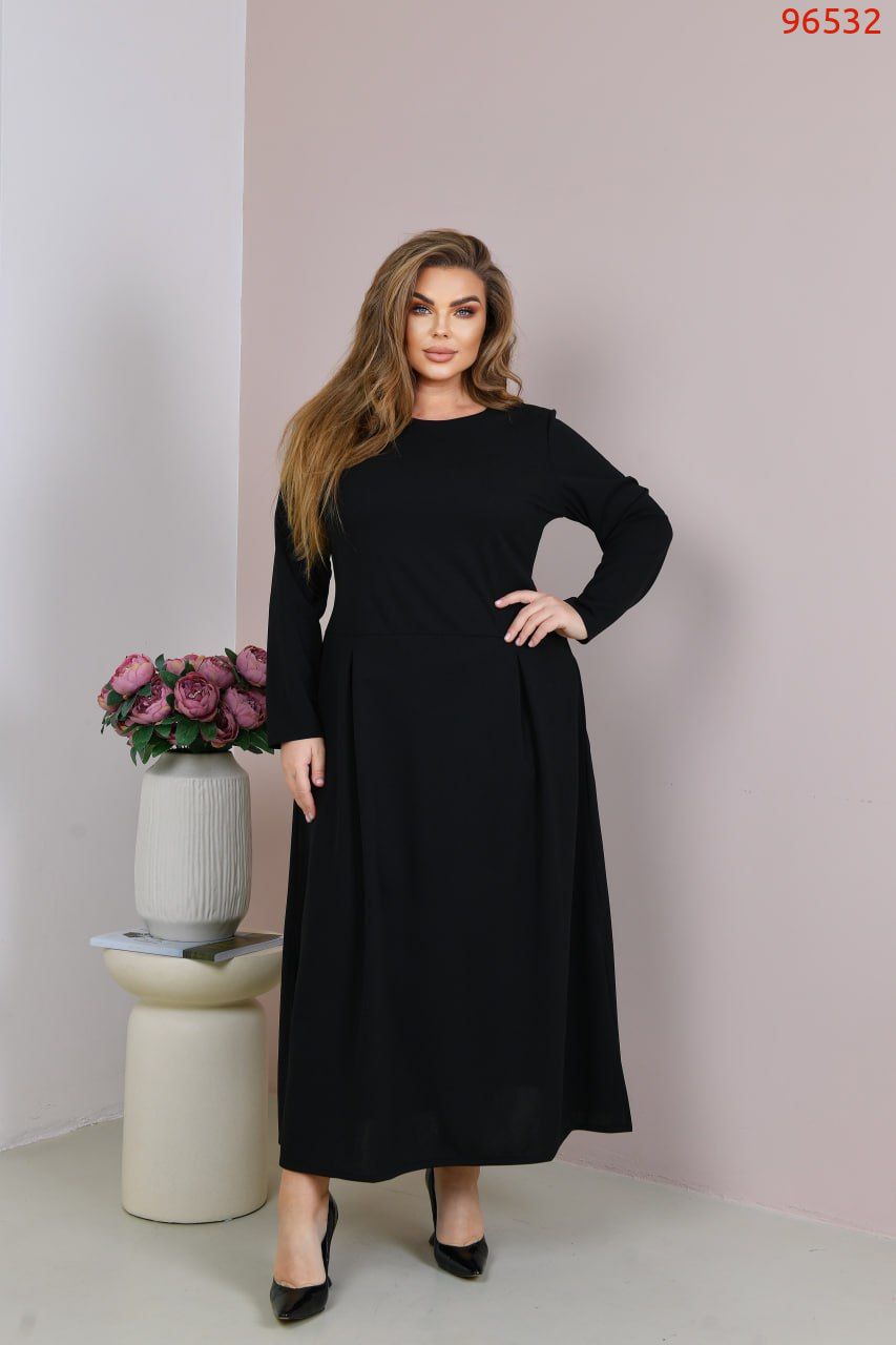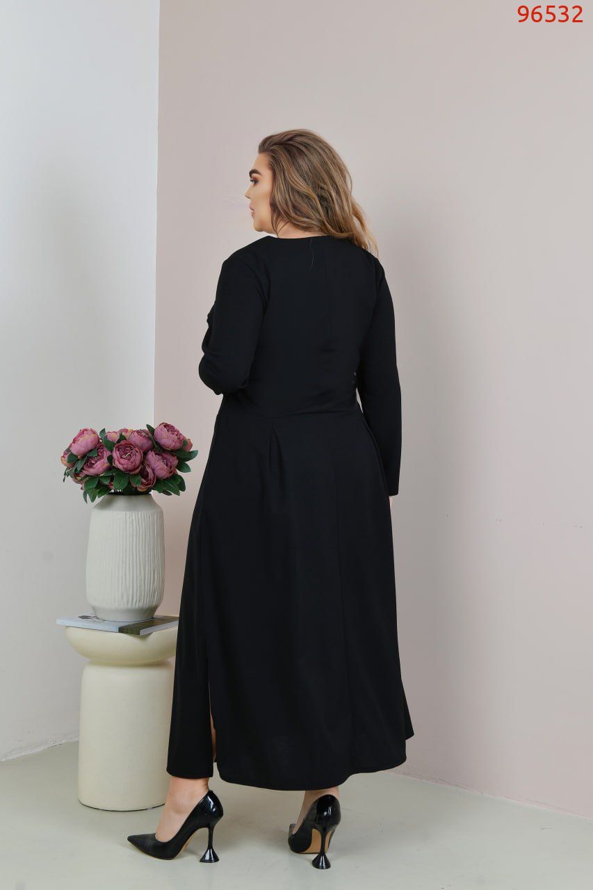 Силует сукні довгий, напівприталений. Виріз горловини круглий, рукави повної довжини. Лінія талії відрізна, трохи занижена, спідниця із защипами, в бічних швах оброблені кишені. Застібки немає. Внизу з боків розрізи, що додає образу жіночності. Сукня добре приховує будь-які недоліки та робить силует стрункішим. Ідеально підійде як для повсякденних справ, так і на свята, якщо додати аксесуарів.