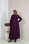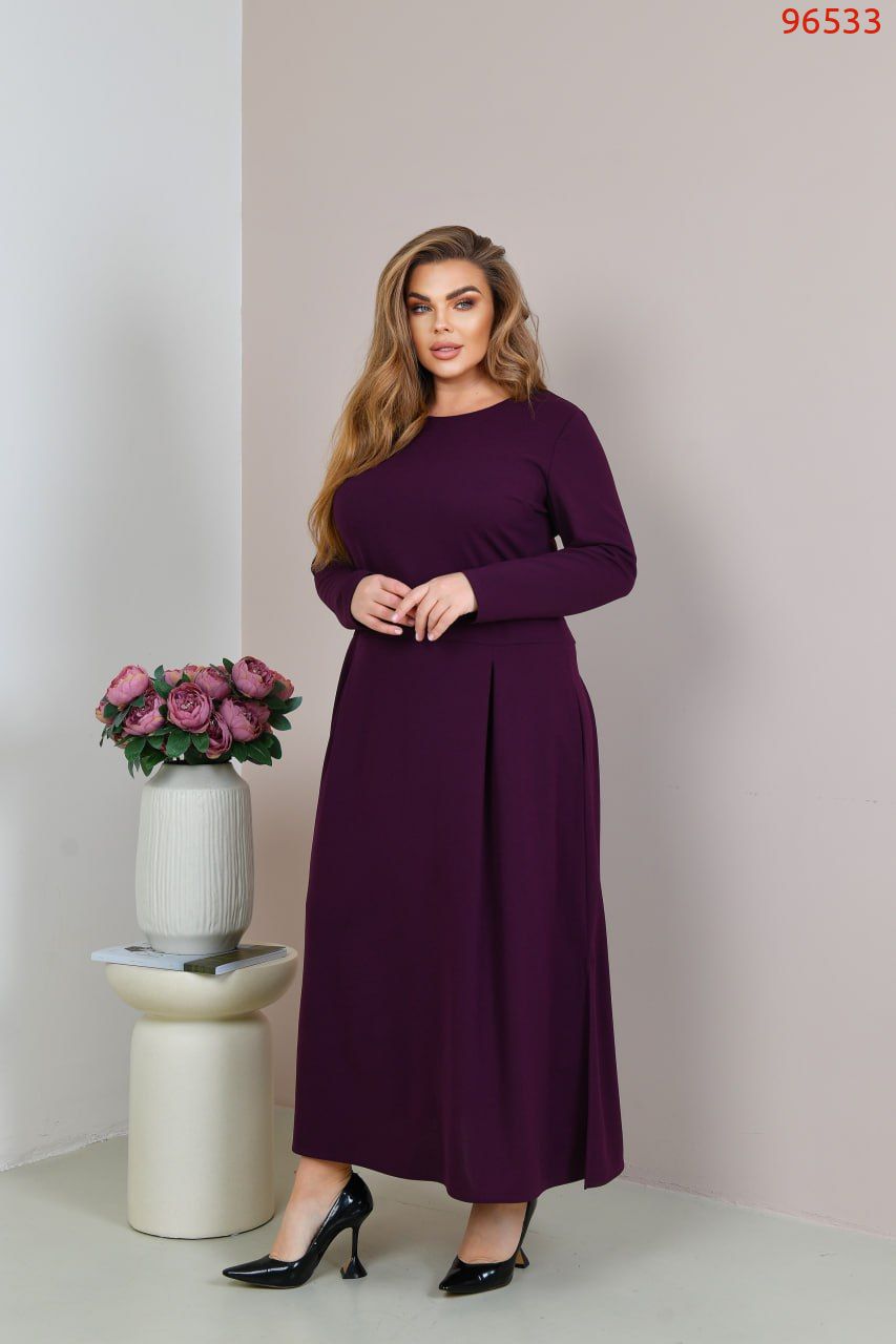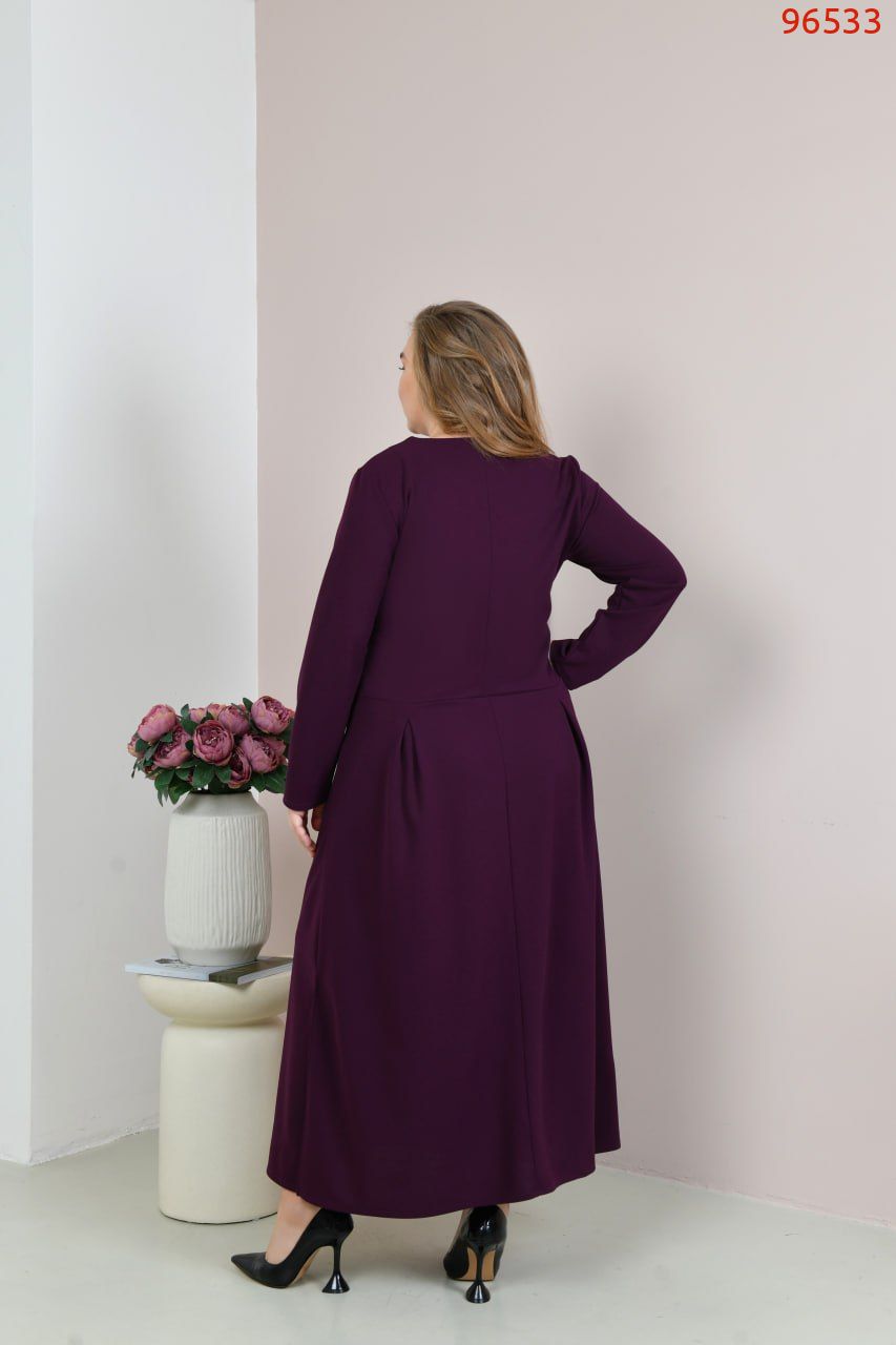 Силует сукні довгий, напівприталений. Виріз горловини круглий, рукави повної довжини. Лінія талії відрізна, трохи занижена, спідниця із защипами, в бічних швах оброблені кишені. Застібки немає. Внизу з боків розрізи, що додає образу жіночності. Сукня добре приховує будь-які недоліки та робить силует стрункішим. Ідеально підійде як для повсякденних справ, так і на свята, якщо додати аксесуарів.
