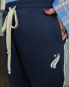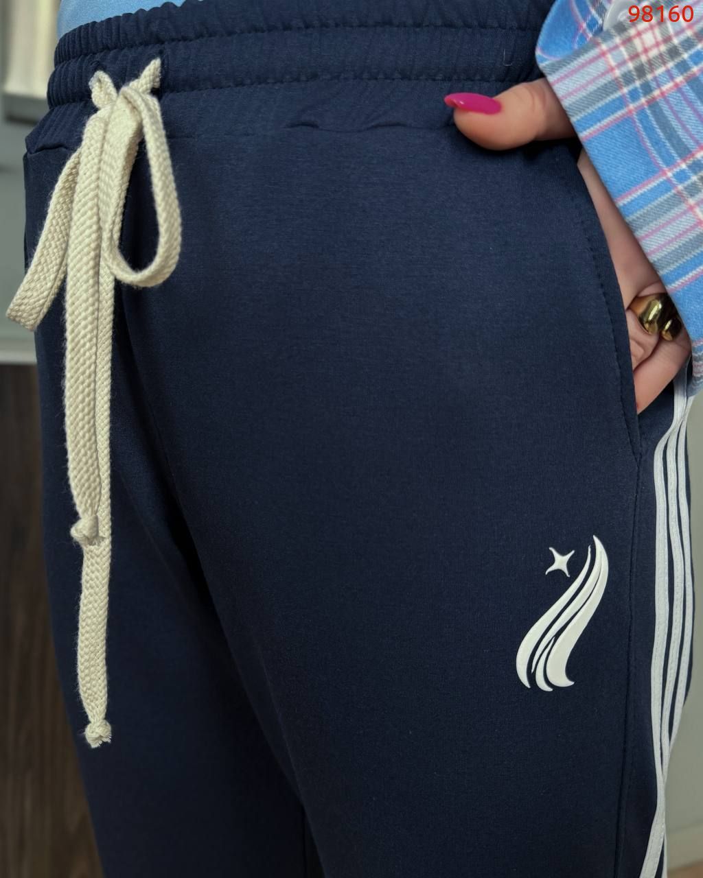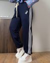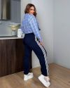 Жіночі штани спортивного типу прямого вільного крою , середньої посадки, пояс на резинці з виведеним шнурком для регулювання об’єму. З кишенями, по бокових швах – подвійні контрастні лампаси.
