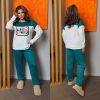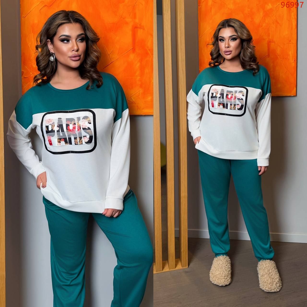 Довжина штанів : 106 см. . Штани з високою посадкою , пояс на гумці . Кофта прямого покрою з нашивкою .