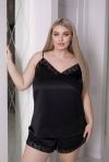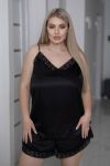 Топ на тонких бретелях із витонченим V-подібним вирізом делікатно підкреслює лінію декольте. Мереживо, що проходить по краю та діагонально перетинає полочку, додає образу динаміки й візуально витягує силует, роблячи його ще більш гармонійним. Вільний крій не сковує рухів, м’яко повторюючи лінії тіла. Бретелі тонкі, регульовані; спинка пряма,зверху на резинці. Шорти вільні,з еластичним поясом забезпечують комфортну посадку, а мереживо по низу додає образу вишуканості.