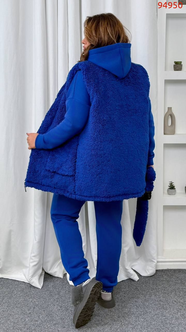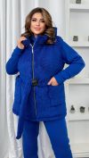 Осінній утеплений костюм трійка - жилет + худі + штани . Жилет на блискавці , комір стійка , з кишенями , пояс в комплекті . Худі на манжеті , з капюшоном . Штани з високою посадкою на гумці , з бічними кишенями , низ на манжеті .