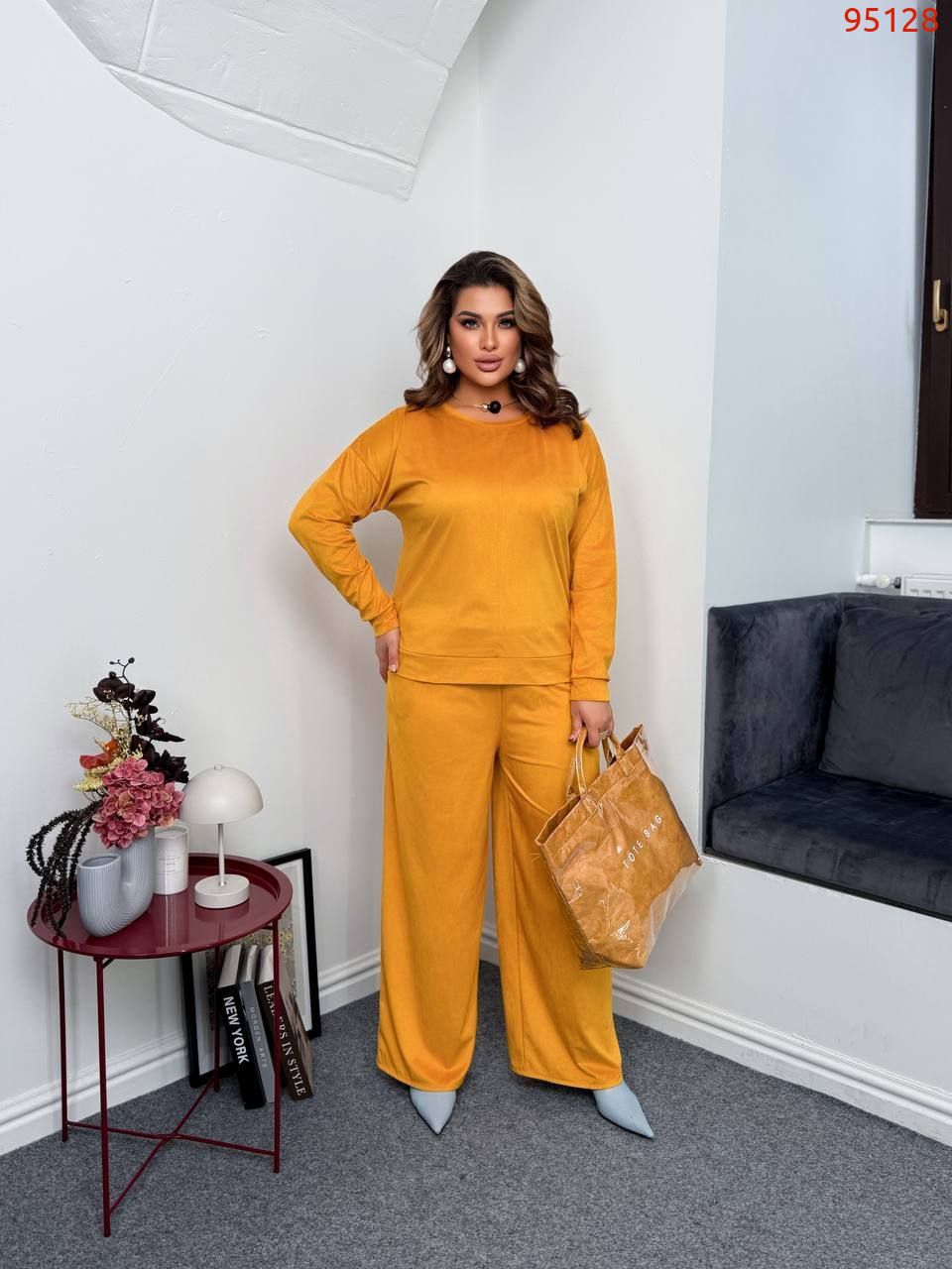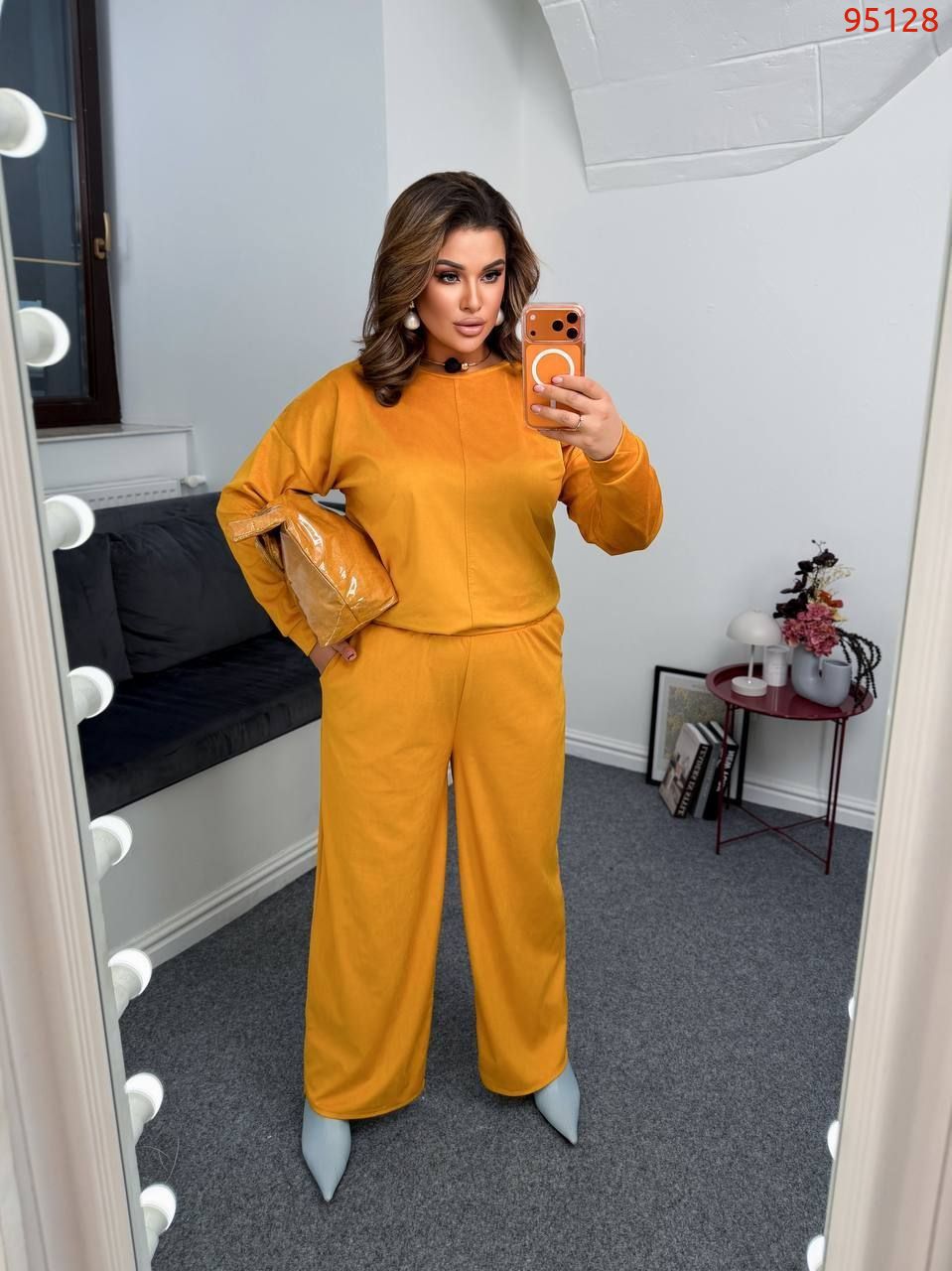 Довжина штанів : 112 см. Прогулянковий костюм двійка . Кофта зі швами на манжеті . Штани з високою посадкою , пояс на гумці .