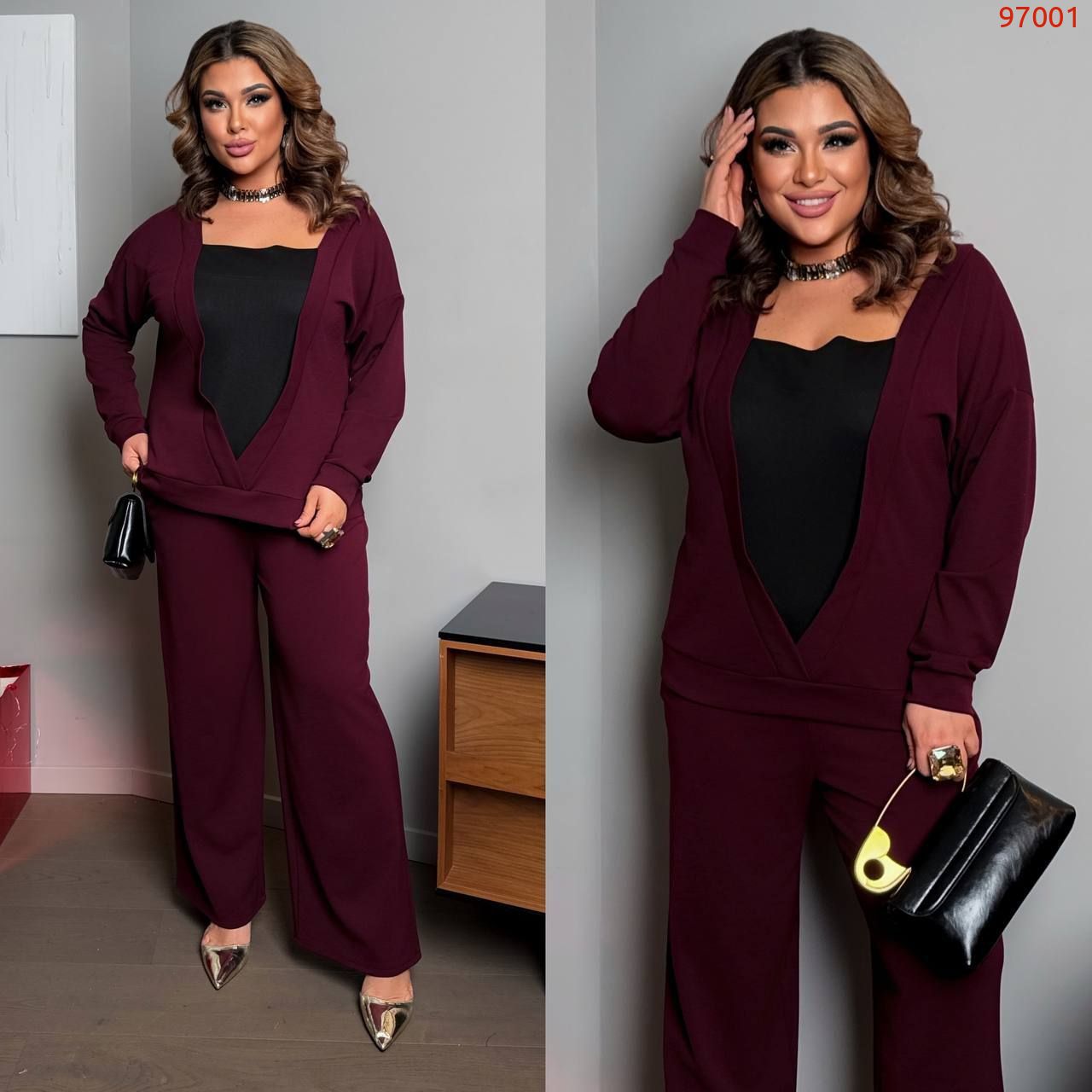 Довжина штанів : 110 см. Стильний костюм двійка . Штани з високою посадкою , пояс на гумці . Кофта прямого покрою на манжеті , з вставкою .