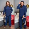 Довжина штанів : 106 см. Стильний костюм двійка . Штани з високою посадкою , пояс на гумці . Кофта прямого покрою з бічними розрізами , та капюшоном .