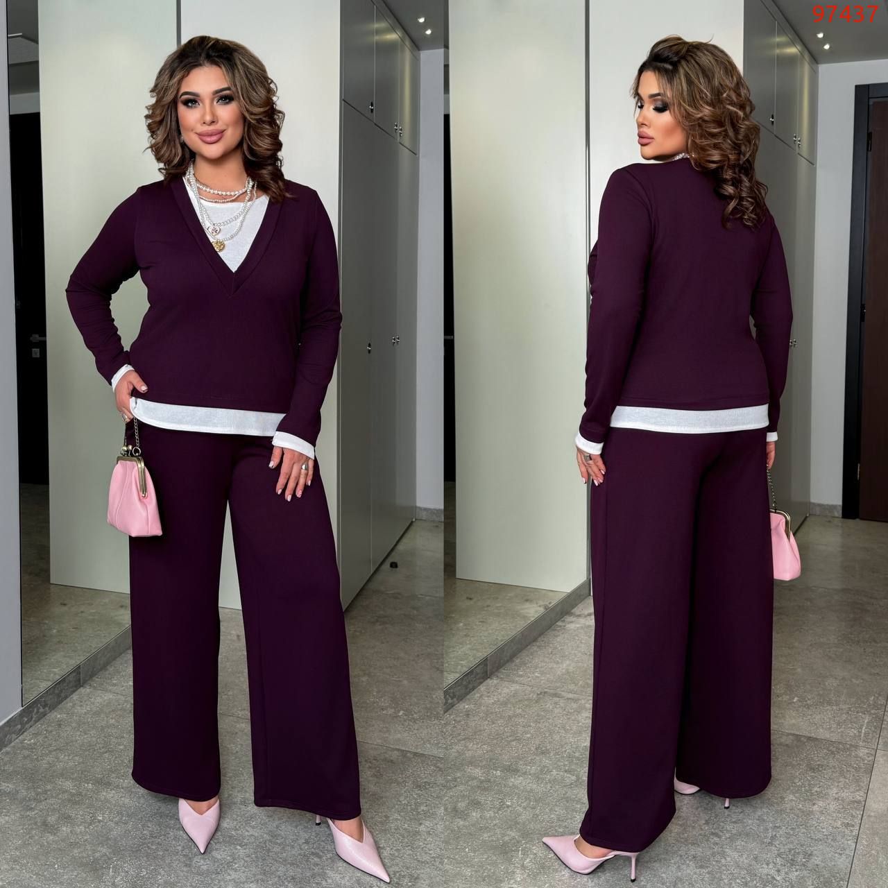 Довжина штанів : 110 см Штани з високою посадкою , пояс на гумці . Кофта прямого покрою , імітація двійки .