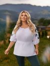 ▪︎ Об’ємні рукави 3/4 з аплікацією " Орхідея" , виконаною з тканини у контрастному кольорі.