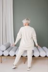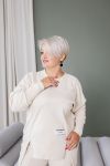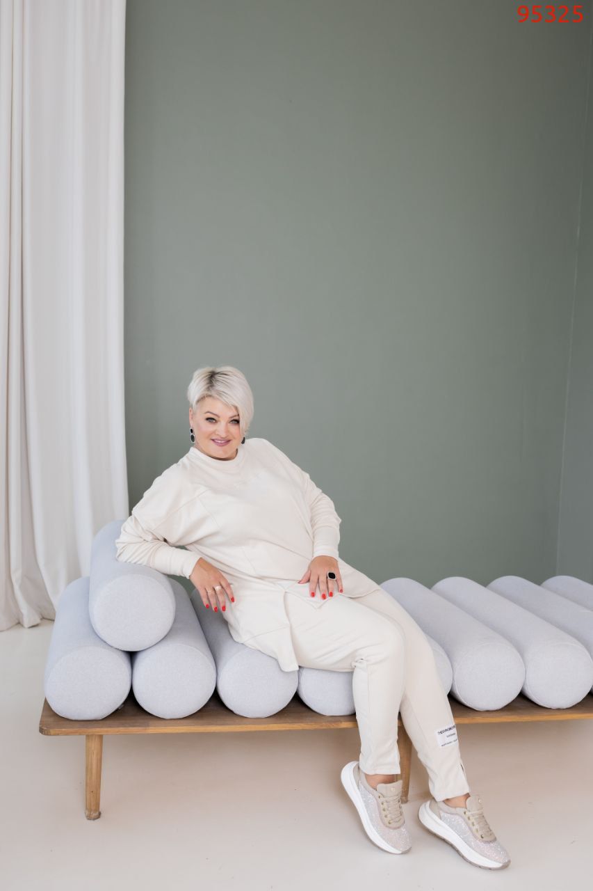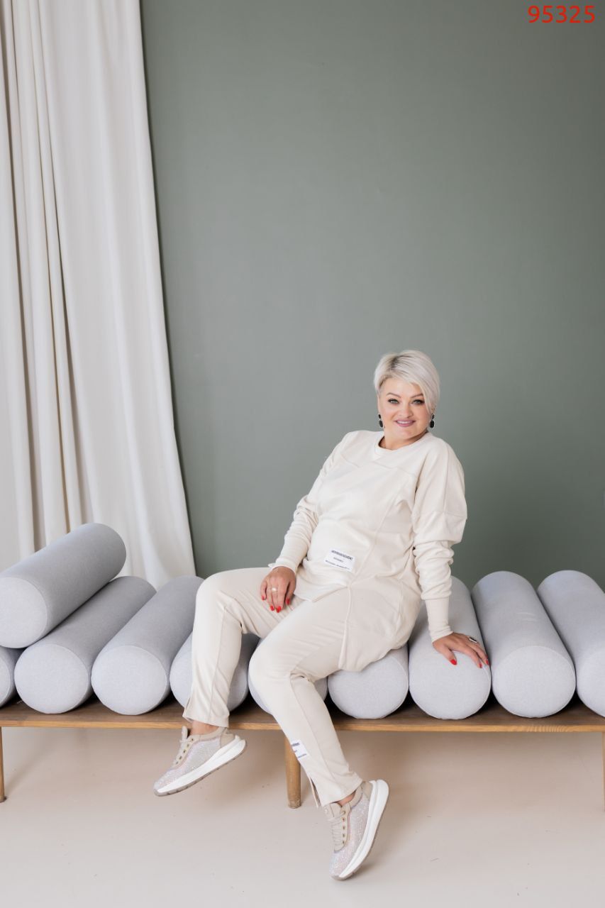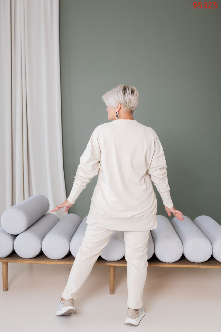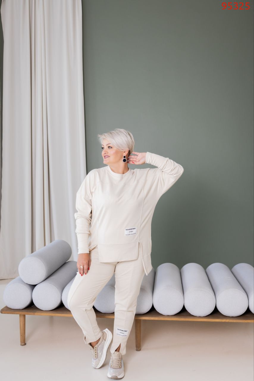 Тканина еластична, має гарну розтяжність. Костюм декорований нашивками, кофта вільна, ззаду подовжена.