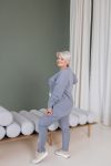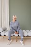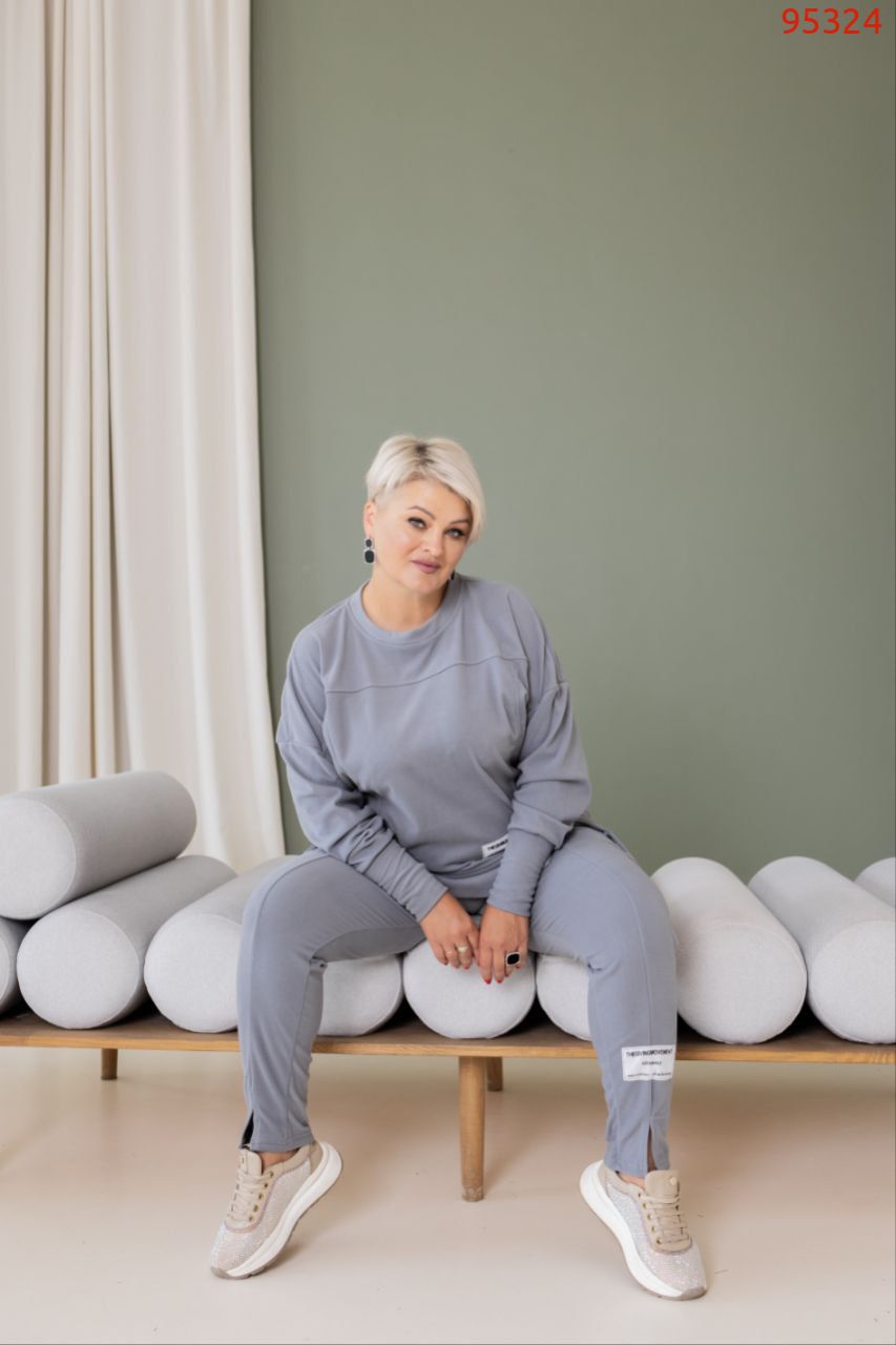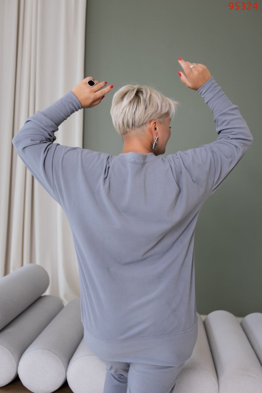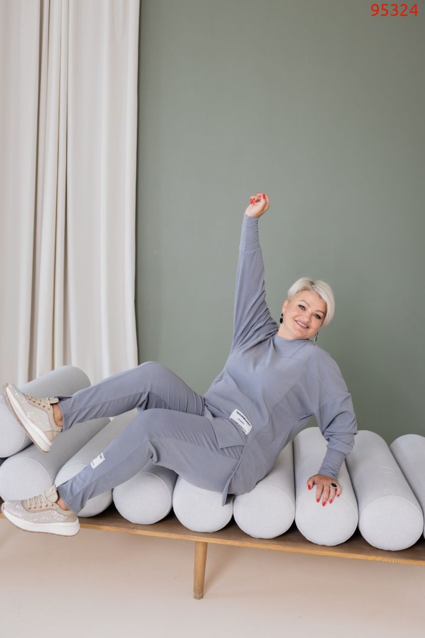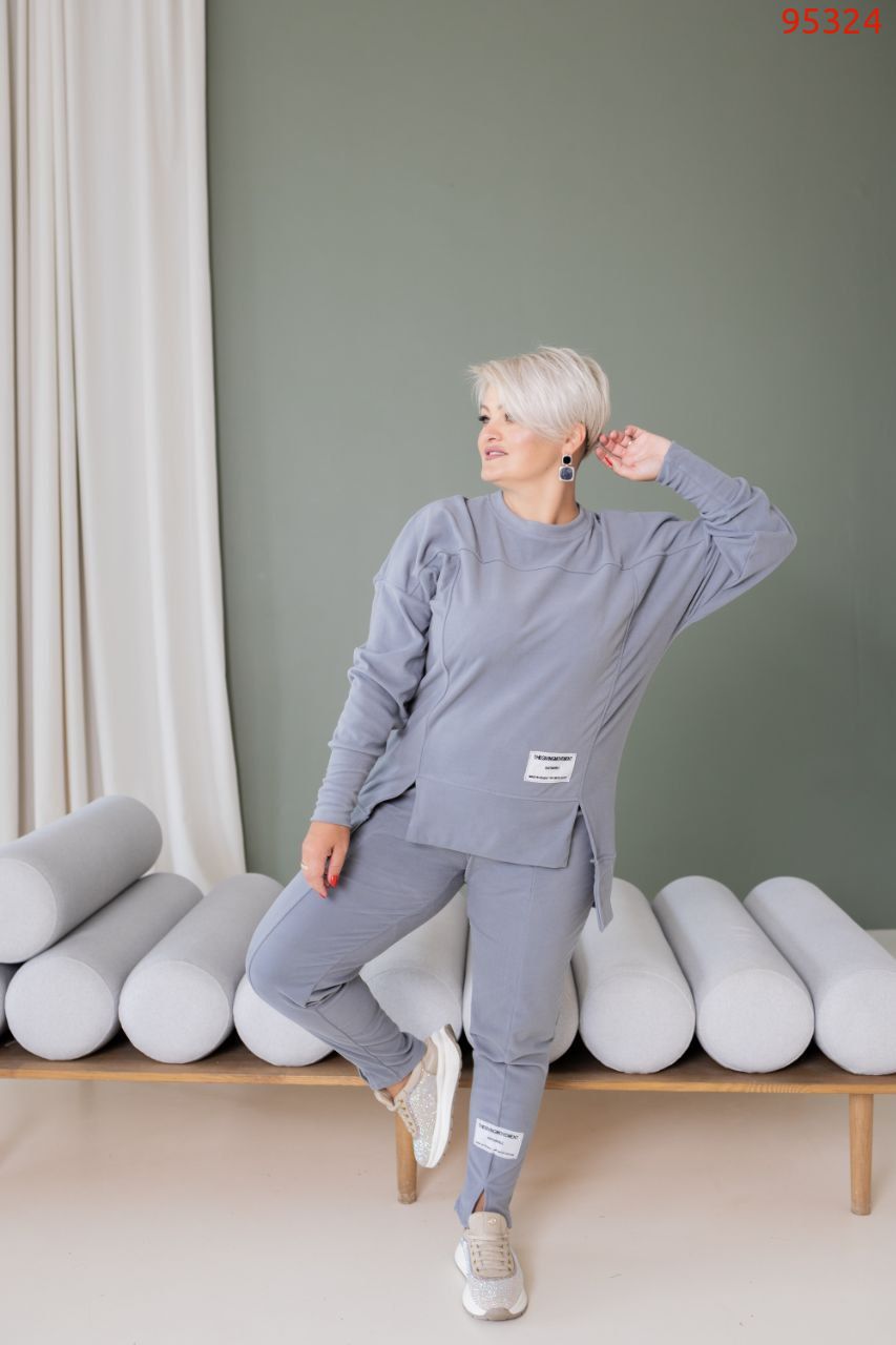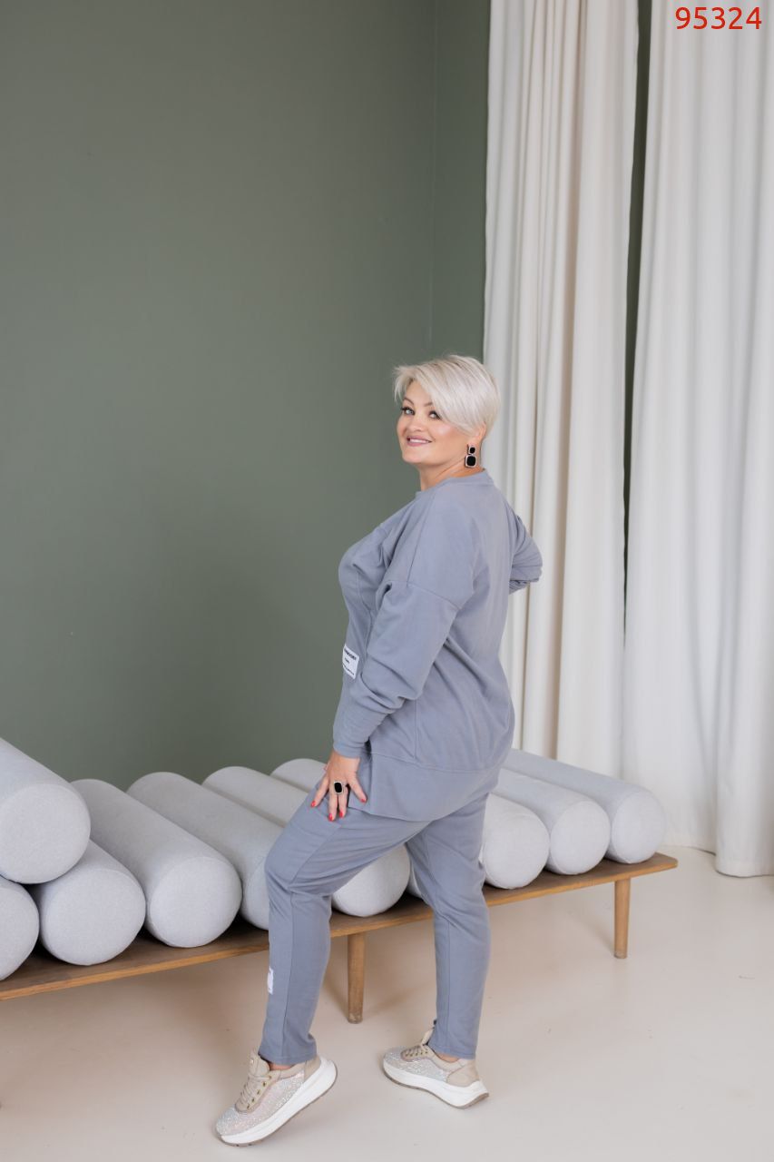 Тканина еластична, має гарну розтяжність. Костюм декорований нашивками, кофта вільна, ззаду подовжена.