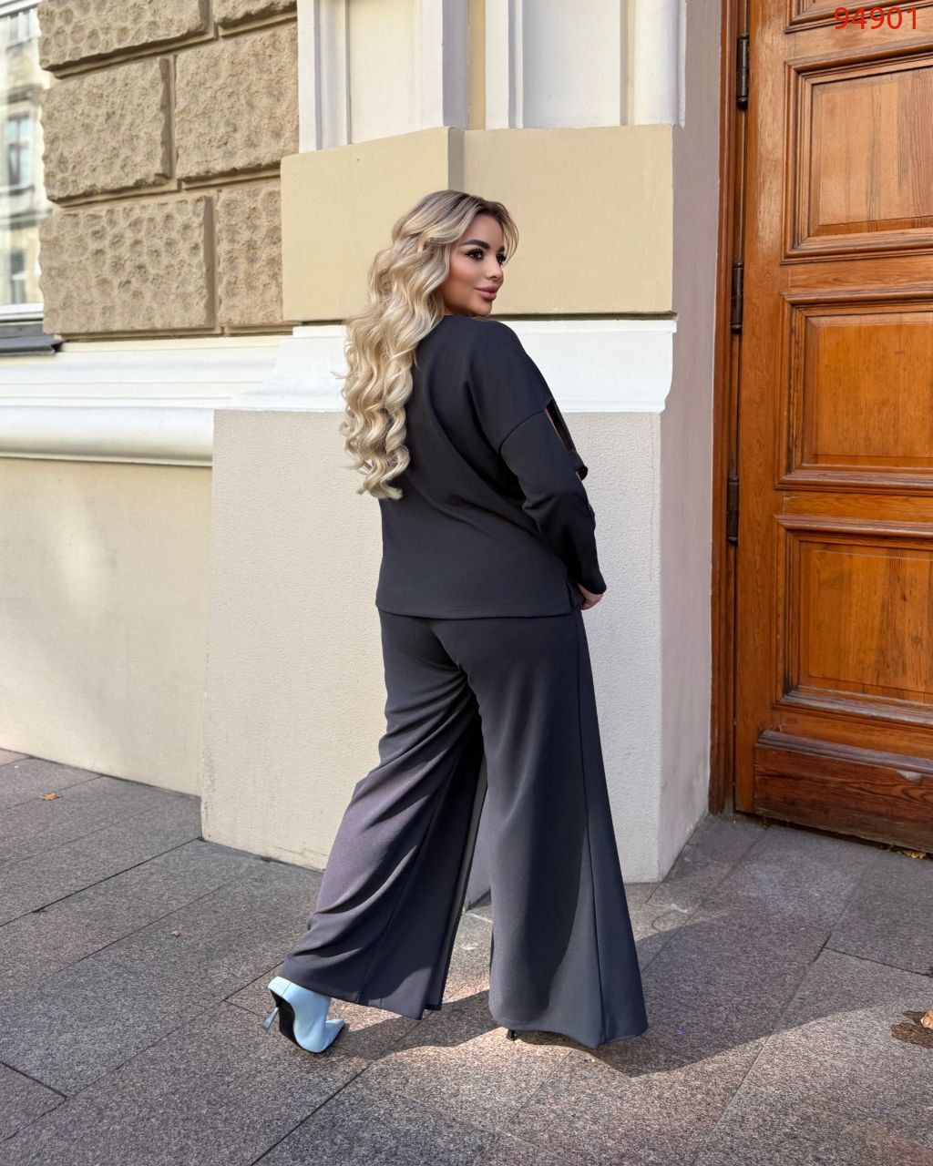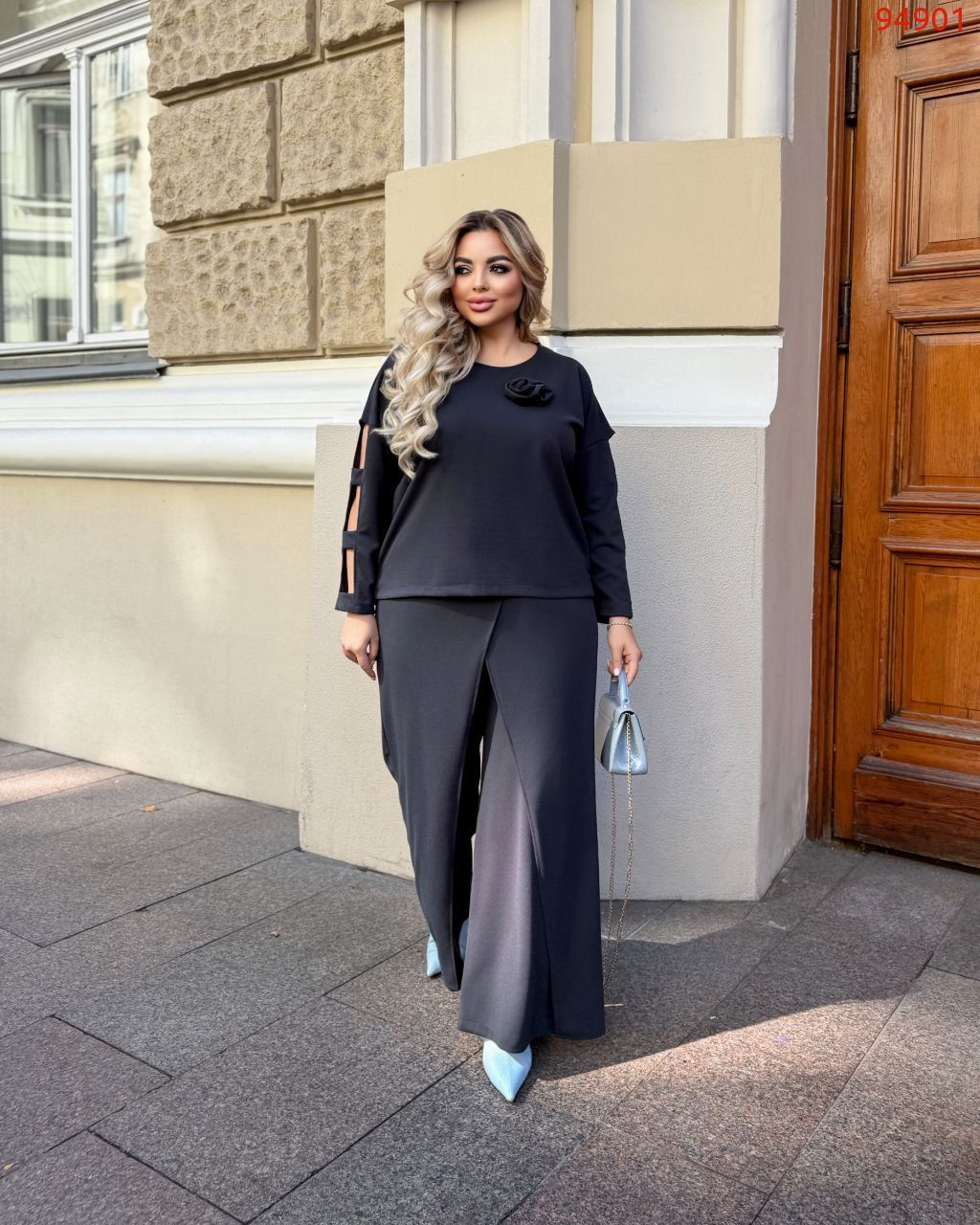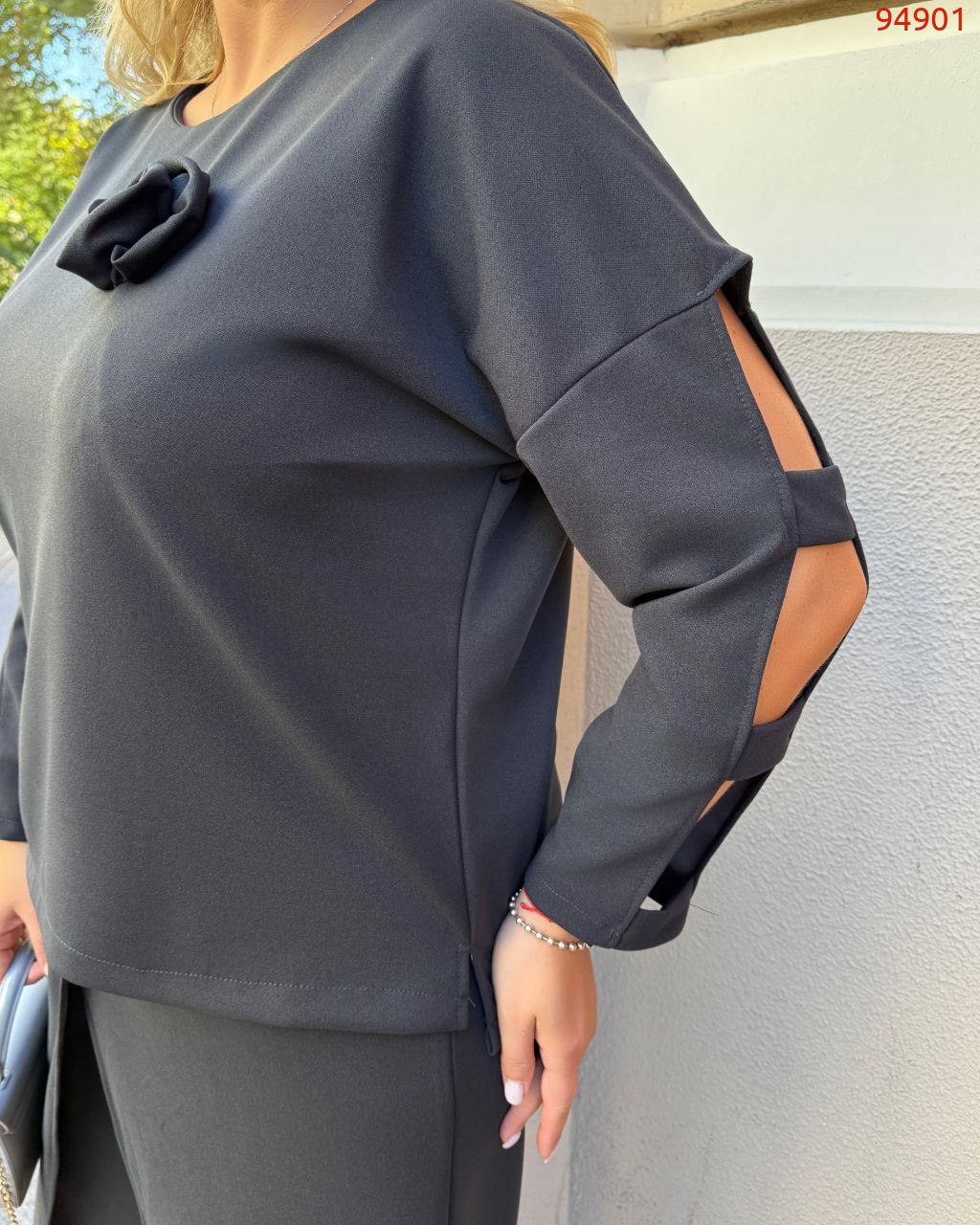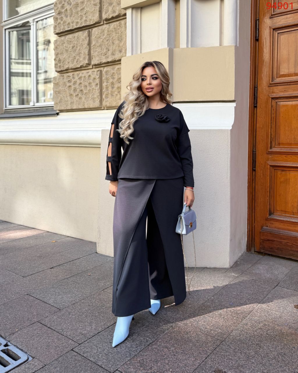 Костюм двійка, елегантна та комфортна модель, тканина тягнеться. Блуза вільного крою з вишуканим акцентом- квіткою на грудях, та оригінальними прорізами на рукавах.