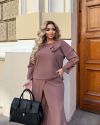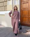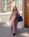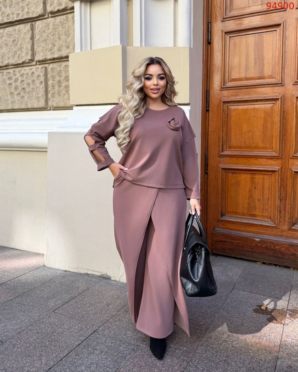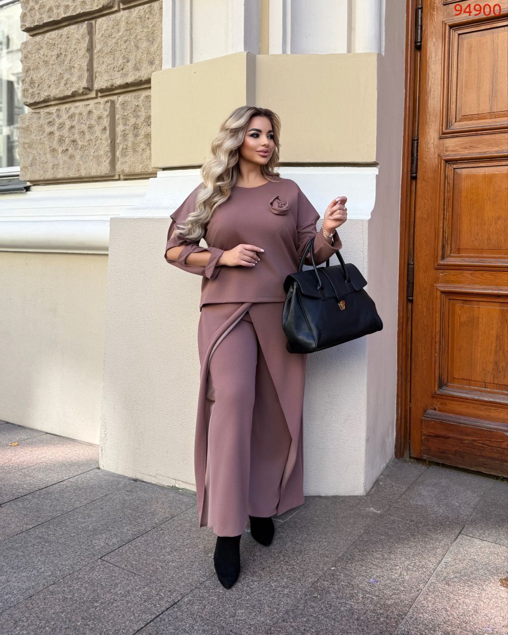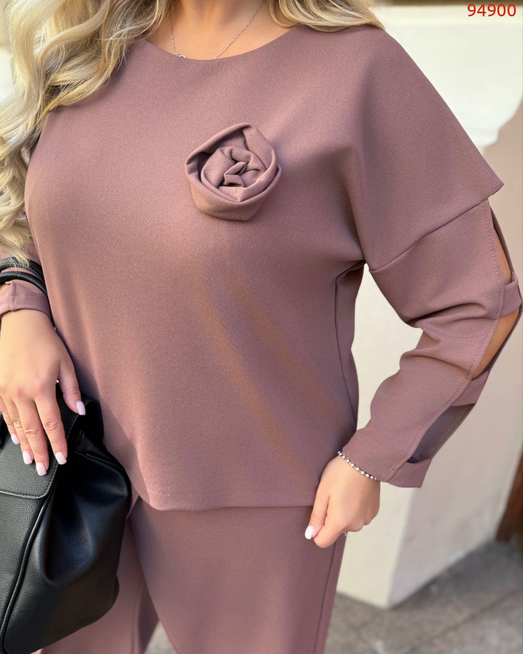 Костюм двійка, елегантна та комфортна модель, тканина тягнеться. Блуза вільного крою з вишуканим акцентом- квіткою на грудях, та оригінальними прорізами на рукавах.