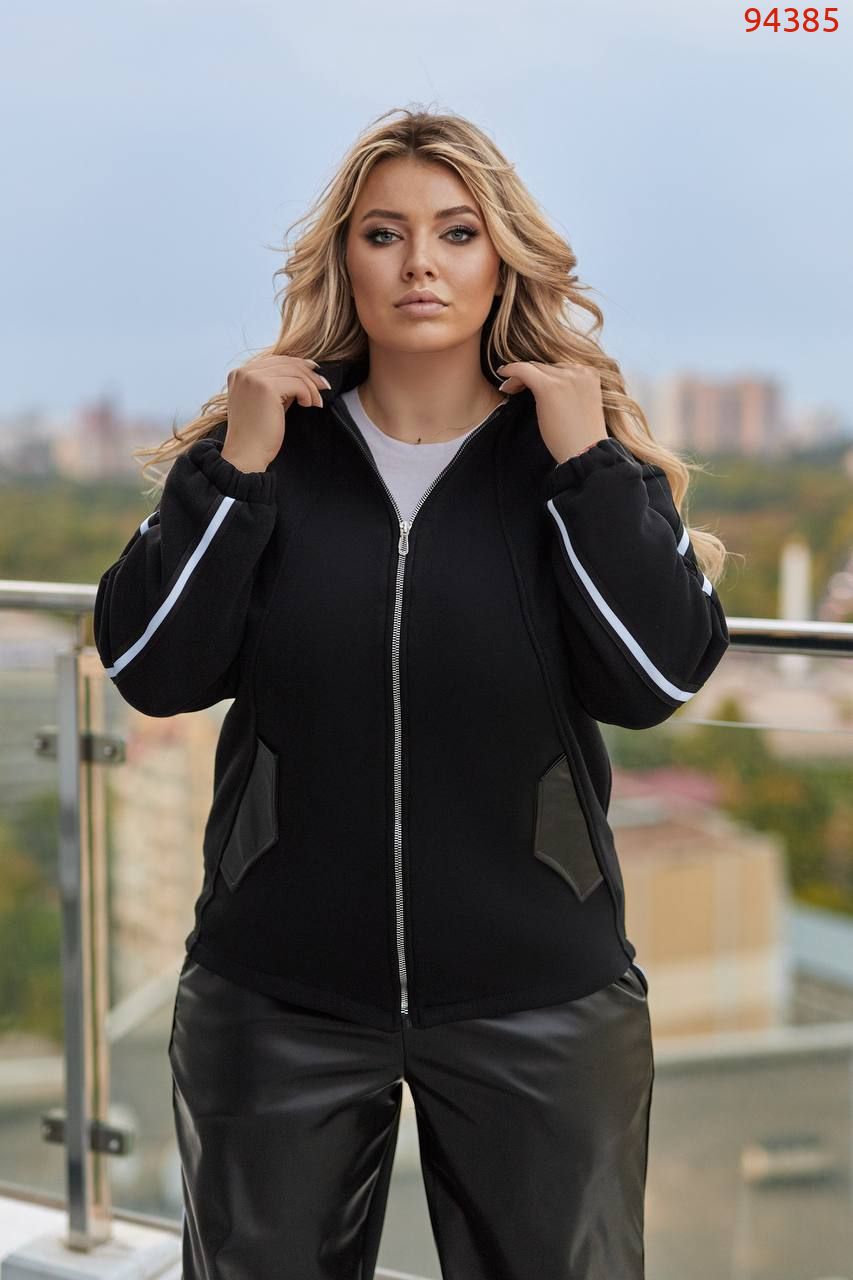Кофта вільного крою, комір з бічними кишенями декоровані шкірою, з застібкою на блискавці, лампаси на рукавах,довгий спущений рукав, манжети на резинці. Брюки: висока посадка,прямий вільний крій, спереду вставки зі штучної шкіри, сзаду -тринитка, пояс на резинці, лампаси з боків.