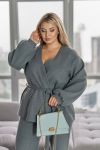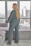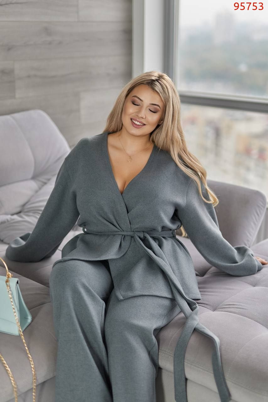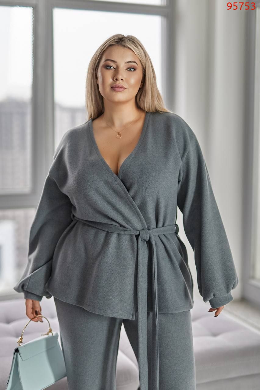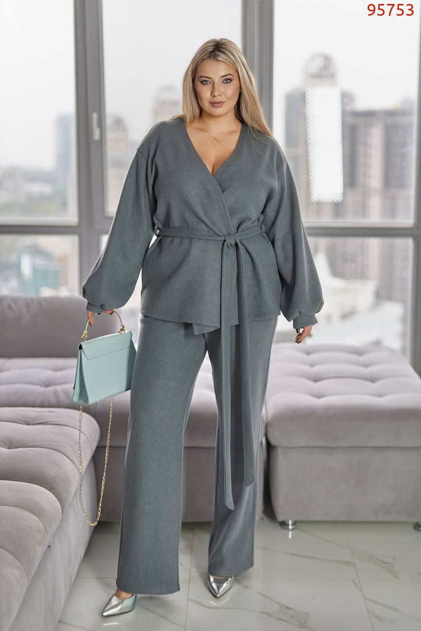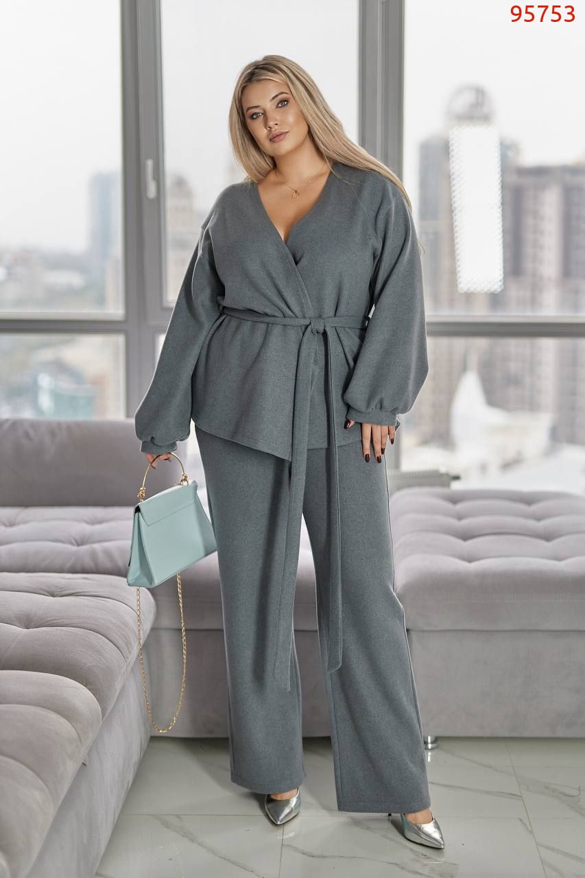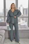 Комплект складається з вільного жакета із запахом і пояса та прямих широких брюк.