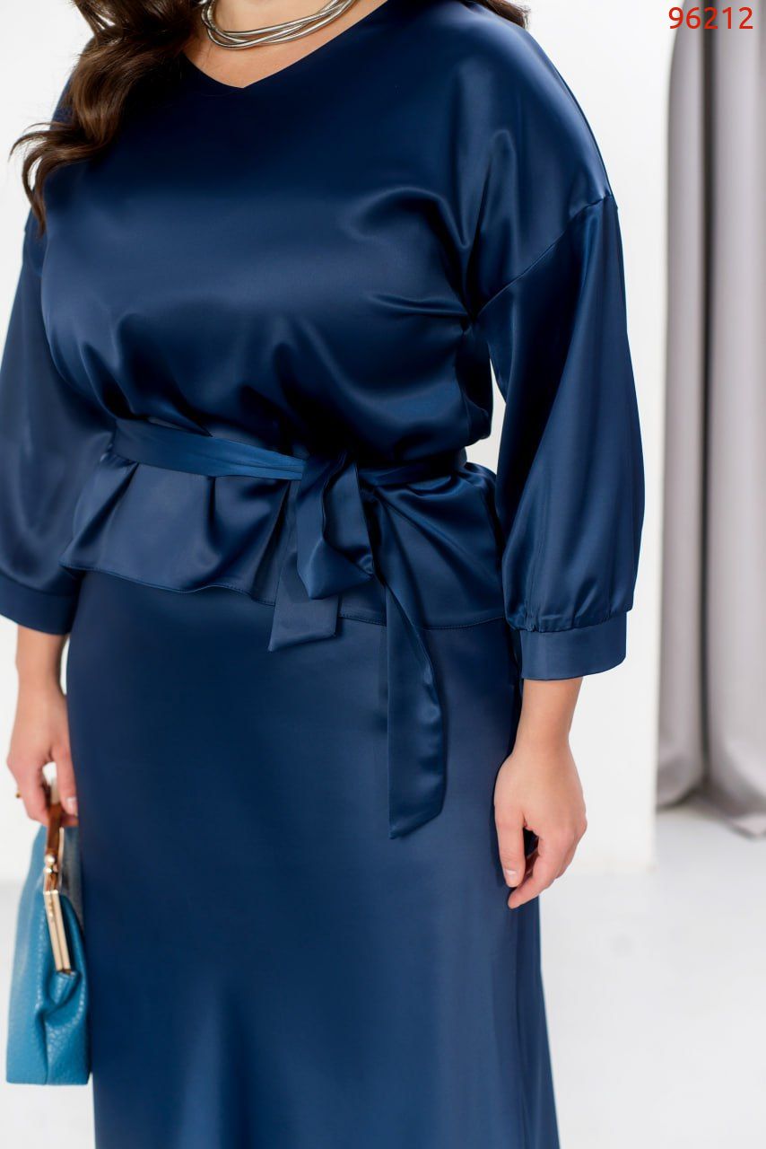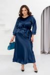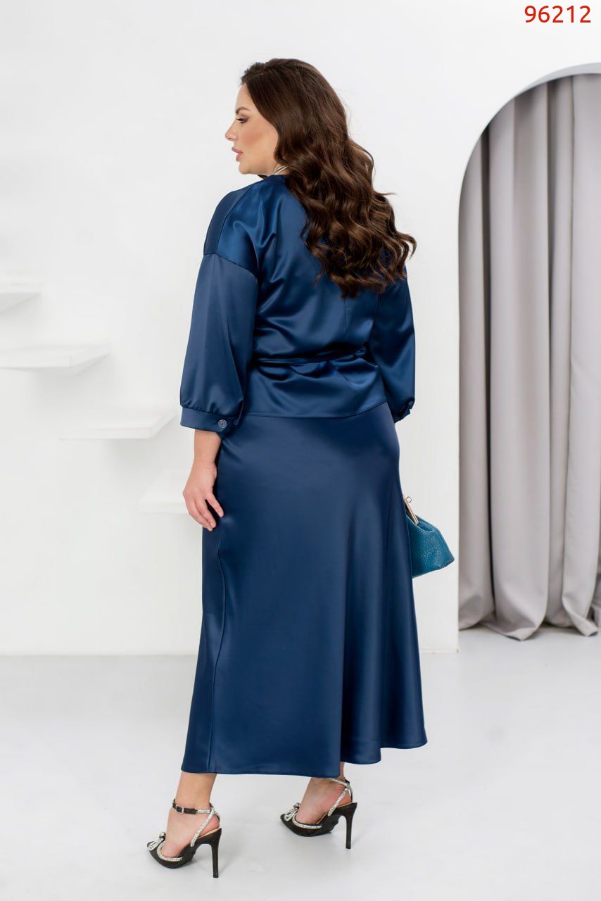 Елегантний святковий костюм зі спідницею, створений із розкішного костюмного шовку, стане вашим ідеальним образом для новорічних свят. Він поєднує витонченість і комфорт, роблячи вас зіркою будь-якої святкової події. Блуза з V-подібним вирізом створює акцент на зоні декольте, додаючи образу жіночності. Спущена лінія плечей та рукави довжиною 3/4 з манжетами на ґудзиках забезпечують стильний вигляд і зручність. Довга спідниця на резинці комфортно сідає по фігурі, а текстильний пояс, що входить до комплекту, дозволяє підкреслити талію та додає завершеності образу. Цей костюм створений, щоб ви відчували себе впевнено й виглядали розкішно під час зустрічі Нового року чи будь-якого іншого особливого заходу.