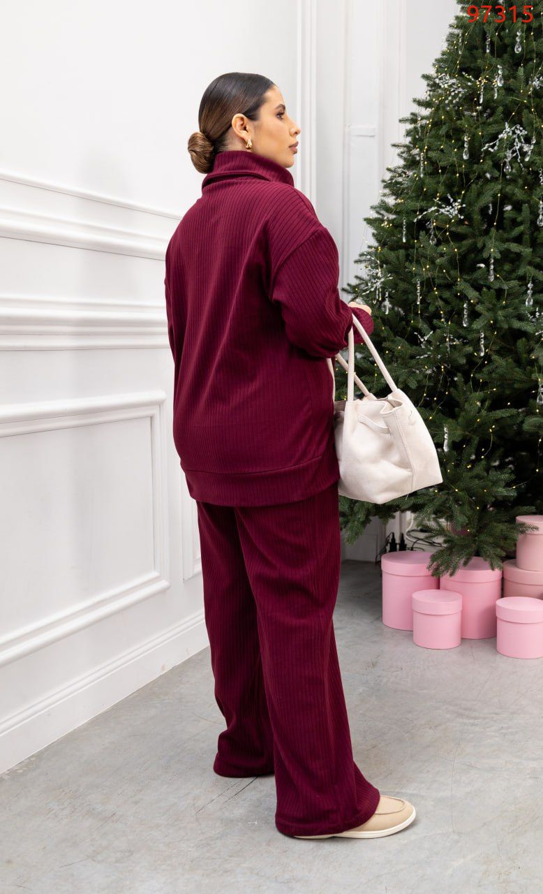 Комфортний костюм-двійка для щоденних образів. Кофта з трикотажу «пума рубчик» приємна до тіла, еластична та доглянута на вигляд. Трендові функціональні блискавки – на горловині й збоку – додають стильного акценту й зручності. Штани середньої посадки на еластичному поясі не сковують рухів, а шовні бокові кишені підсилюють практичність.