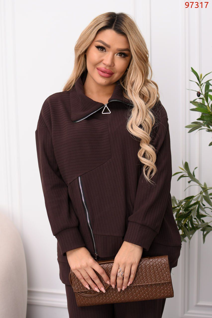 Комфортний костюм-двійка для щоденних образів. Кофта з трикотажу «пума рубчик» приємна до тіла, еластична та доглянута на вигляд. Трендові функціональні блискавки – на горловині й збоку – додають стильного акценту й зручності. Штани середньої посадки на еластичному поясі не сковують рухів, а шовні бокові кишені підсилюють практичність.