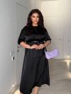 Талія підкреслена тонким чорним ременем, створюючи жіночний силует. Спідниця, що струмує, довжиною нижче коліна, що робить образ витонченим і елегантним.