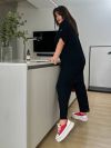 Костюм складається з штанів та сорочки. Штани мають прямий крій та комфортну посадку з гумкою на талії та манжетам. Сорочка вільного фасону з короткими рукавами та застібкою на гудзики. Стильний і сучасний комплект, що чудово підходить для повсякденного гардеробу.