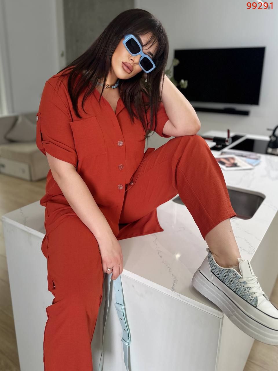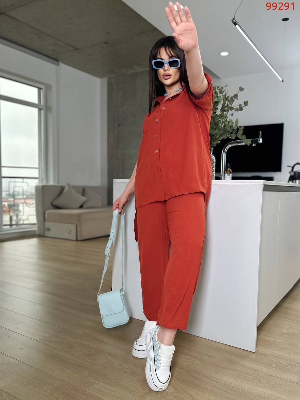 Костюм складається з штанів та сорочки. Штани мають прямий крій та комфортну посадку з гумкою на талії та манжетам. Сорочка вільного фасону з короткими рукавами та застібкою на гудзики. Стильний і сучасний комплект, що чудово підходить для повсякденного гардеробу.