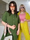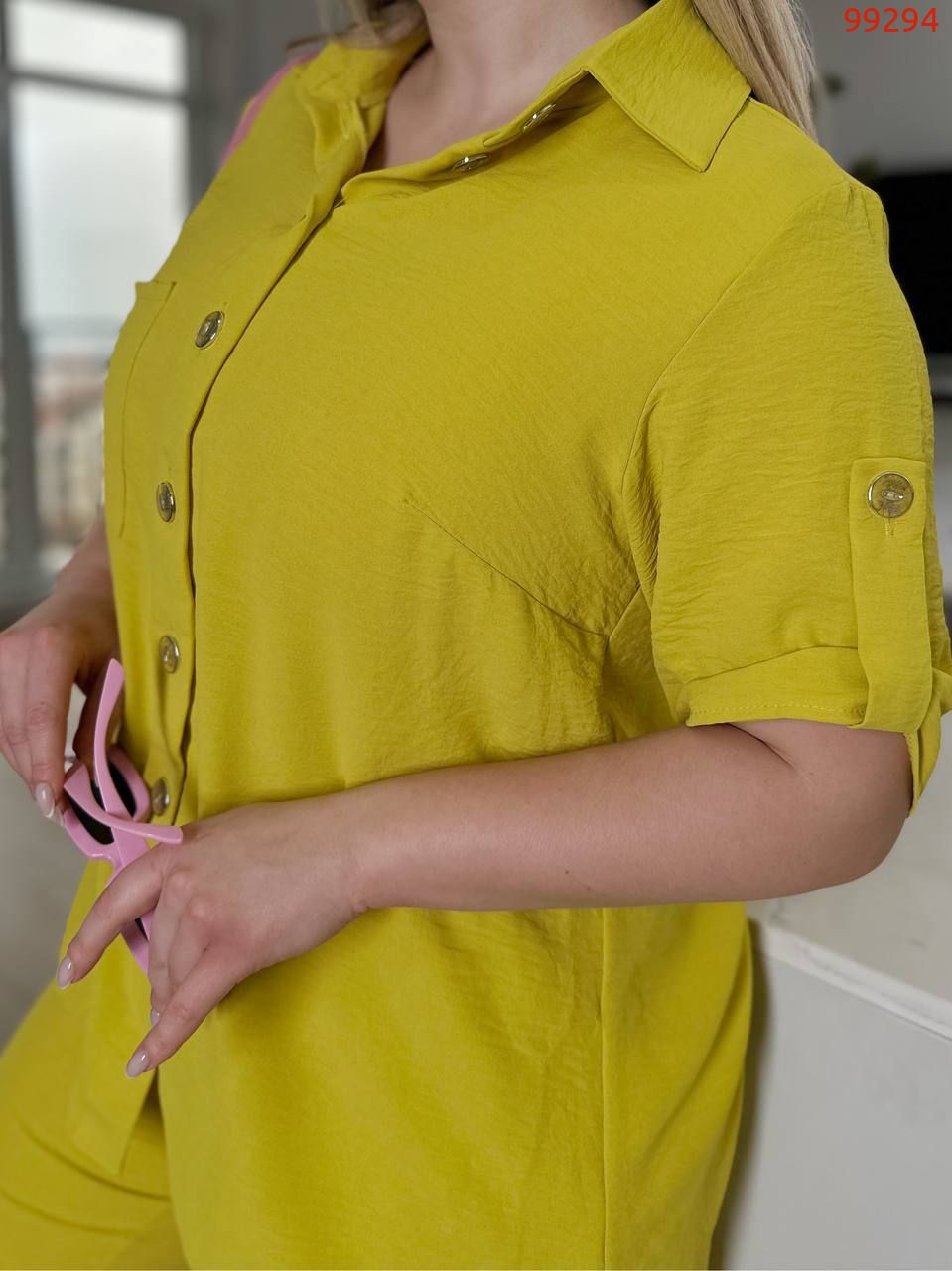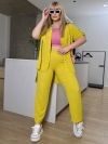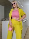 Костюм складається з штанів та сорочки. Штани мають прямий крій та комфортну посадку з гумкою на талії та манжетам. Сорочка вільного фасону з короткими рукавами та застібкою на гудзики. Стильний і сучасний комплект, що чудово підходить для повсякденного гардеробу.
