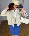 Модель прямого силуету з асиметричною застібкою та кишенею на кнопці. Рукави у формі ліхтарика. Об'ємну куртку можна спокійно одягнути з будь-якою річчю, навіть худі, рубашка або оверсайз светр.
