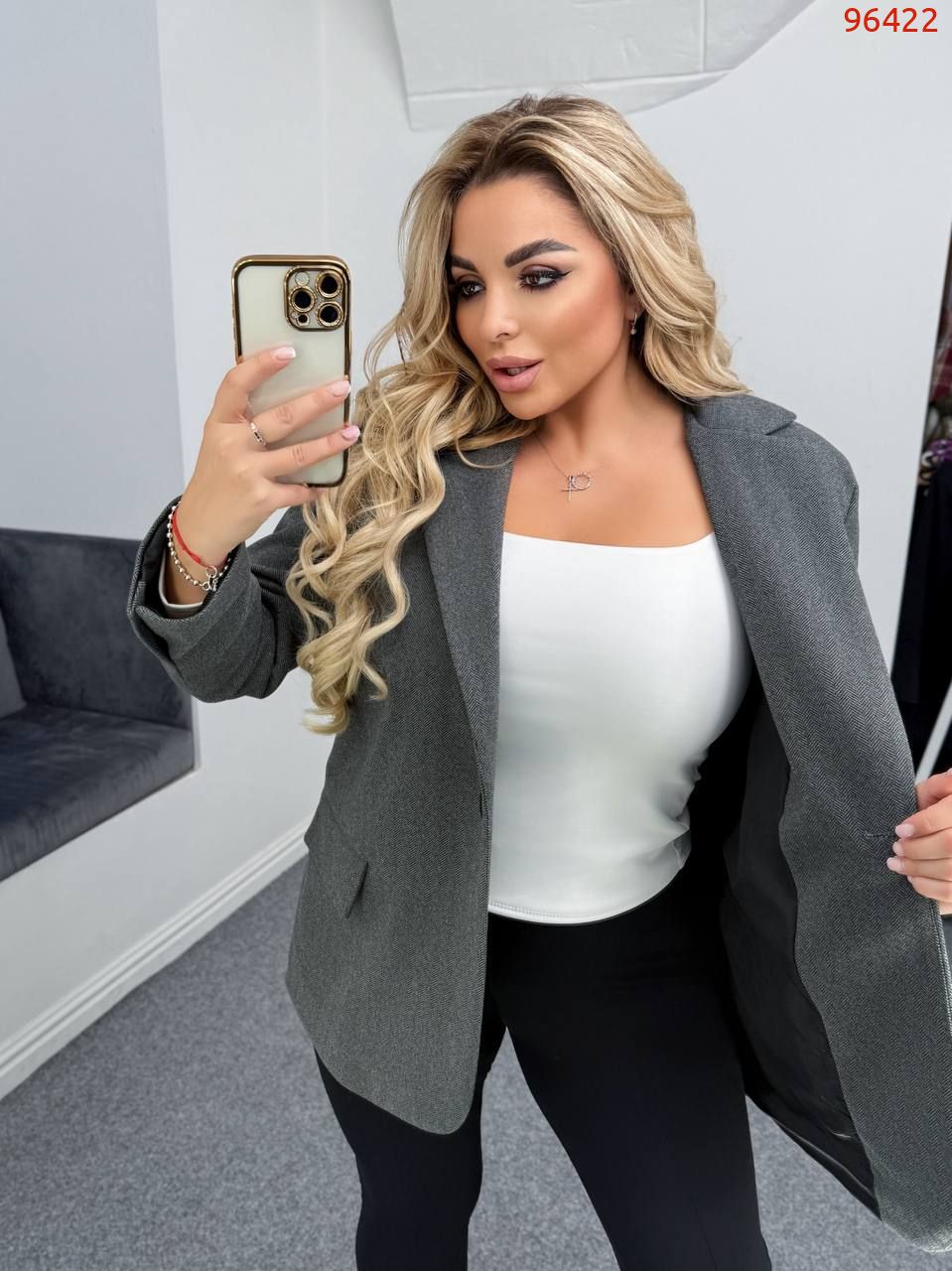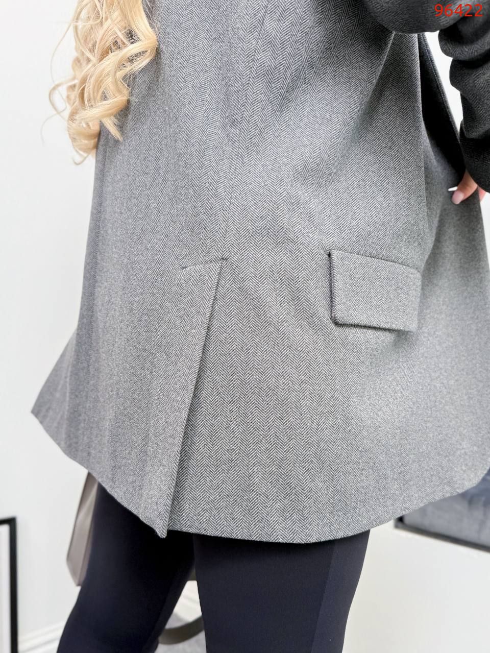 Жакет застібається на ґудзики, з боків робочі кишені , на рукавах розрізи з ґудзиками. По спинці по низу два розрізи.