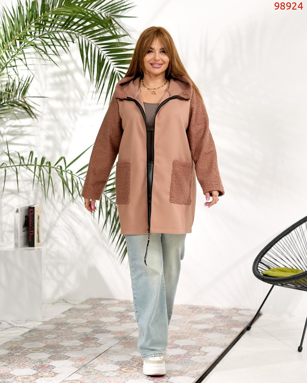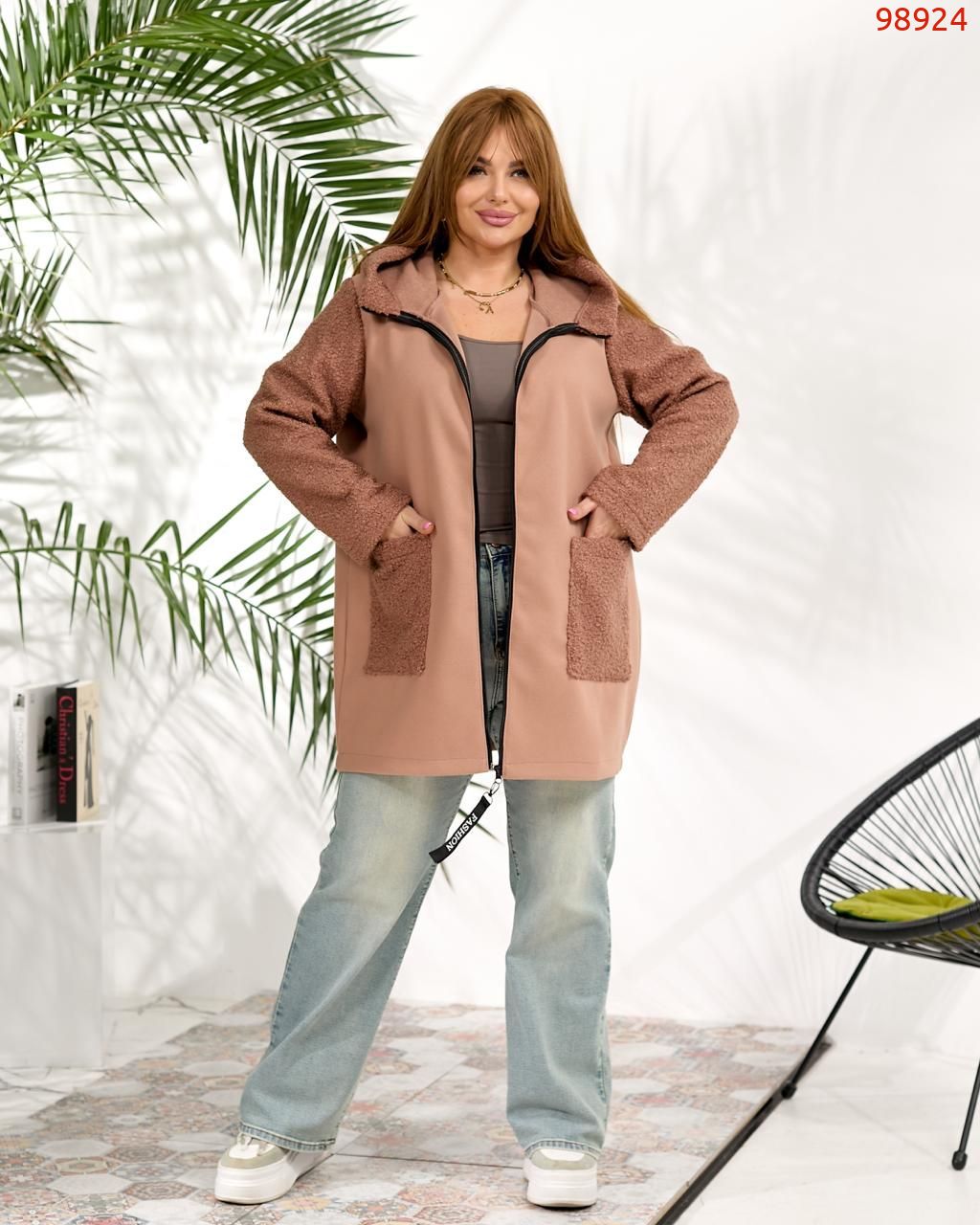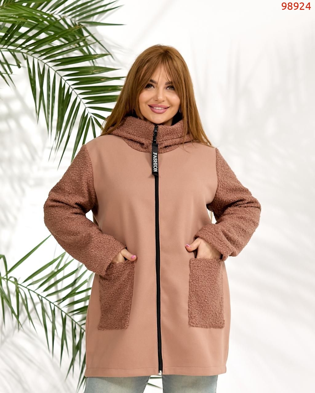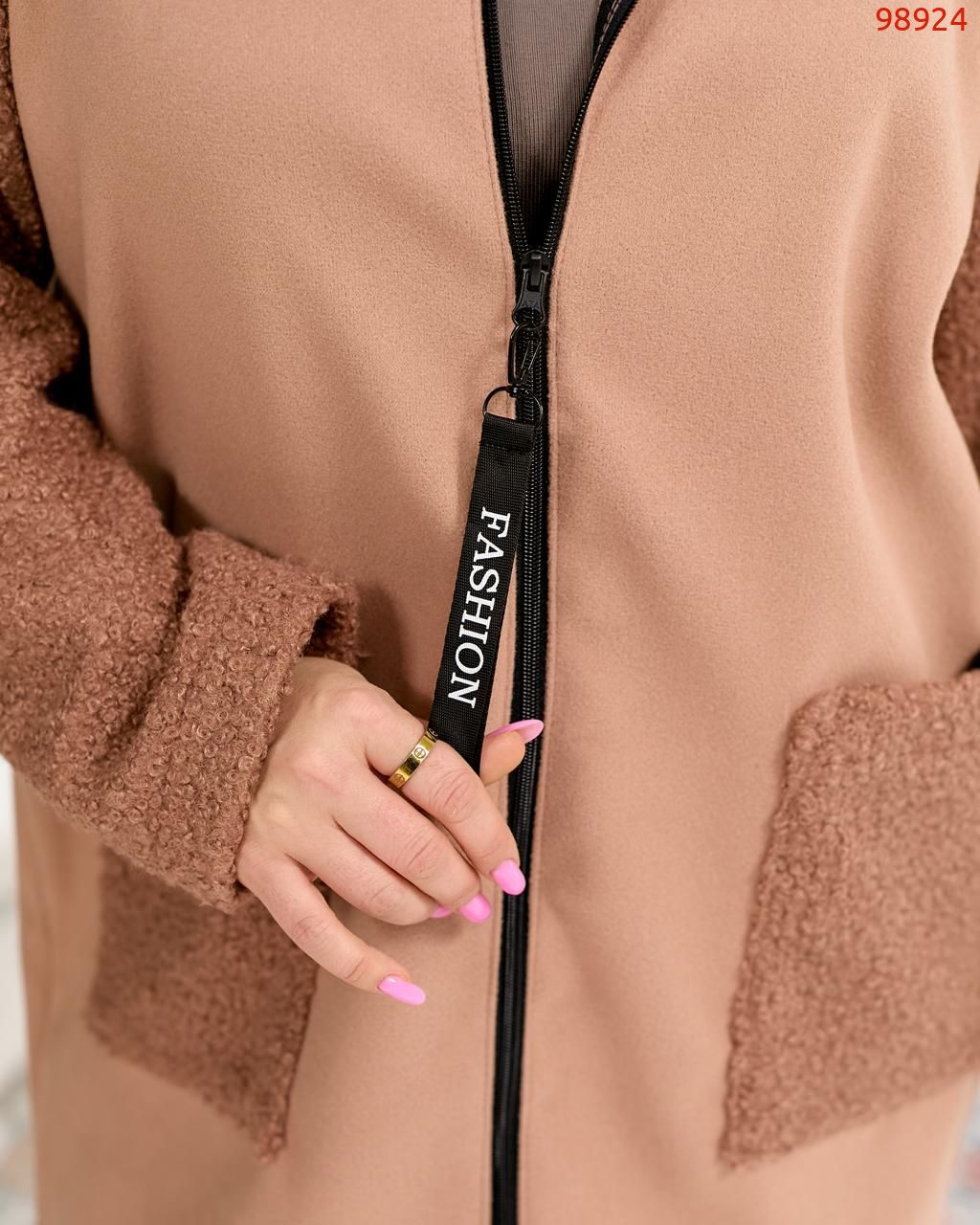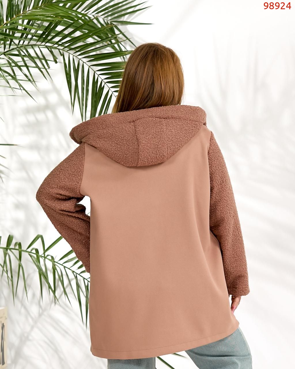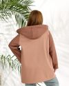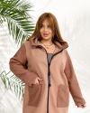 Демісезонне пальто з кашеміру та букле вовни. Виріб вільного силуету, має дві оздобленні кишені з обох боків, з капюшоном, застібка на блискавці, рукав вшивний.