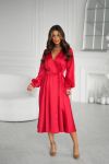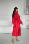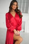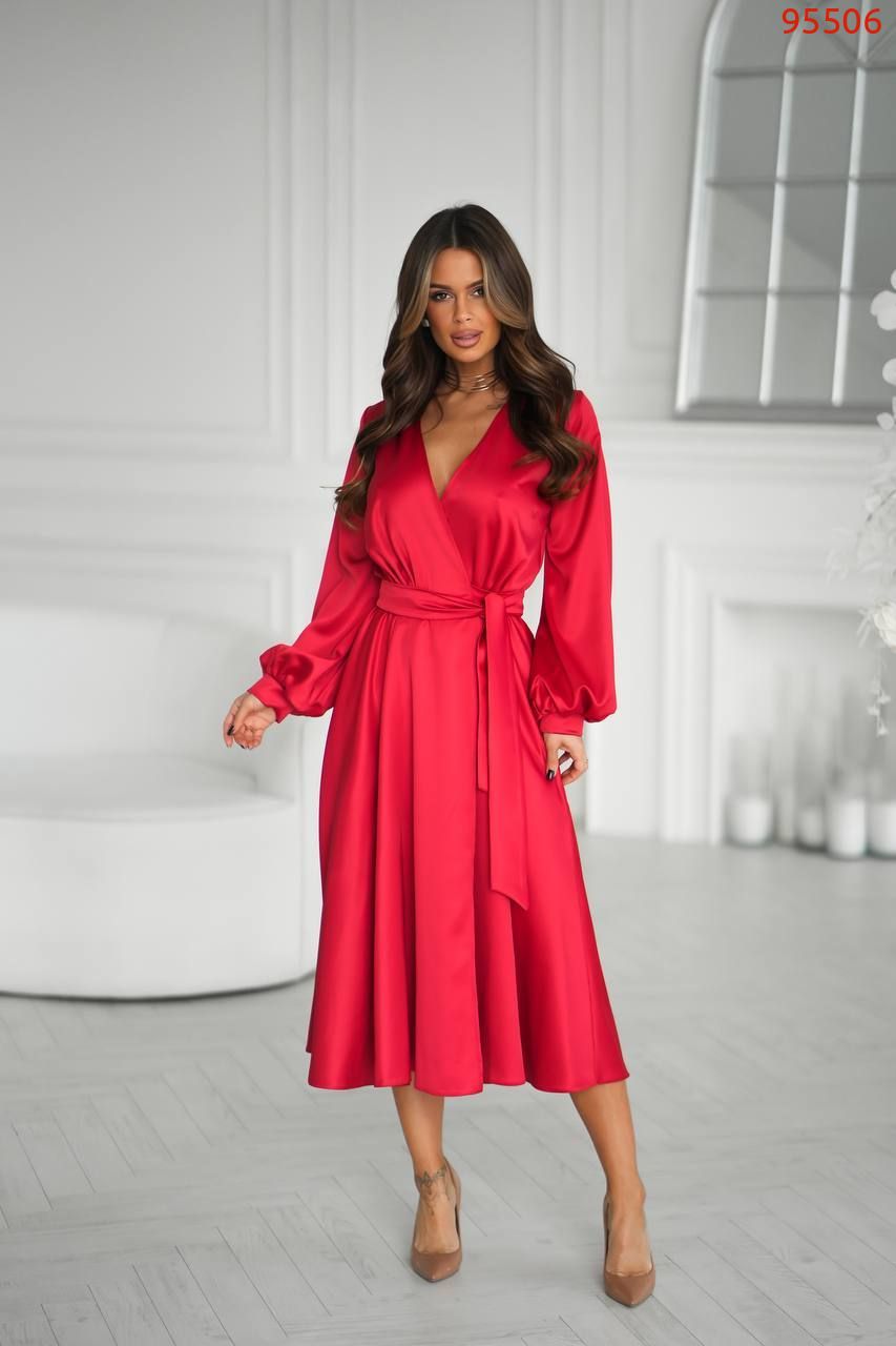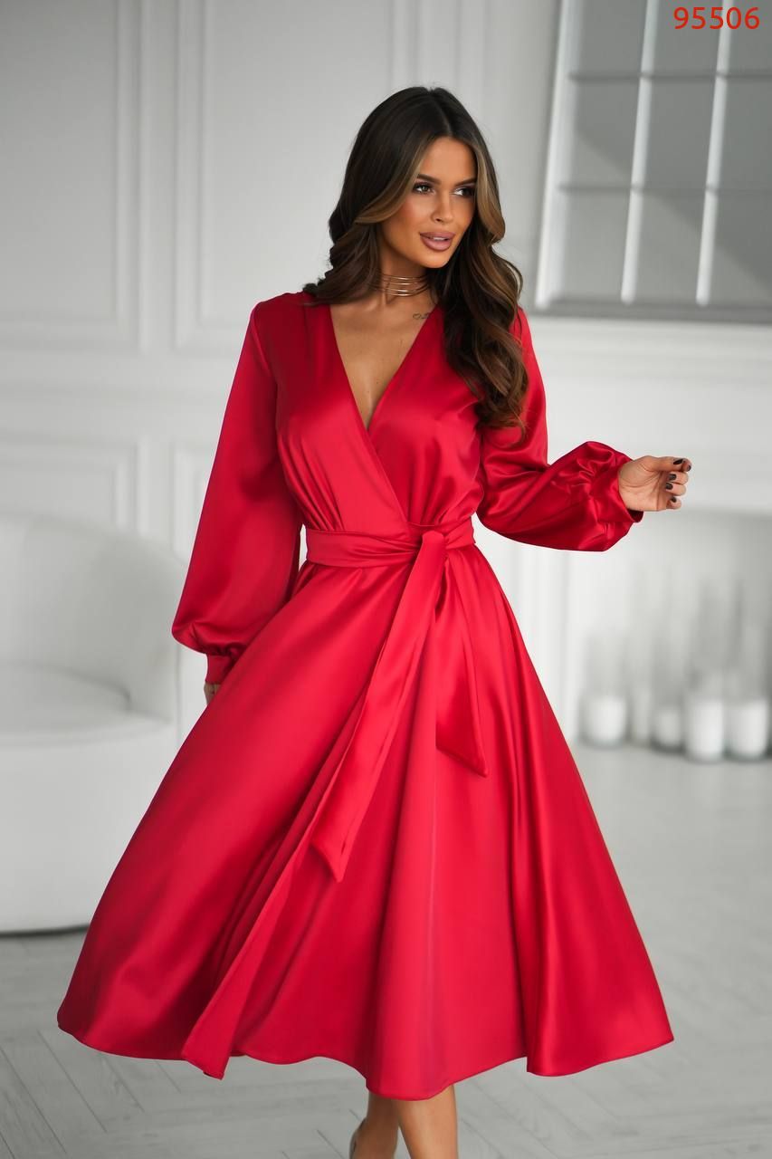 Глибоке V-подібне декольте в поєднанні із запахом м’яко акцентує лінію талії, а пояс додає силуету витонченості.