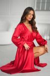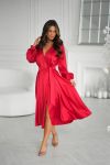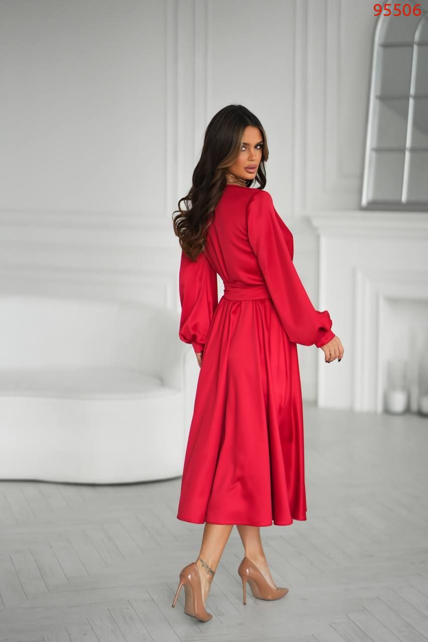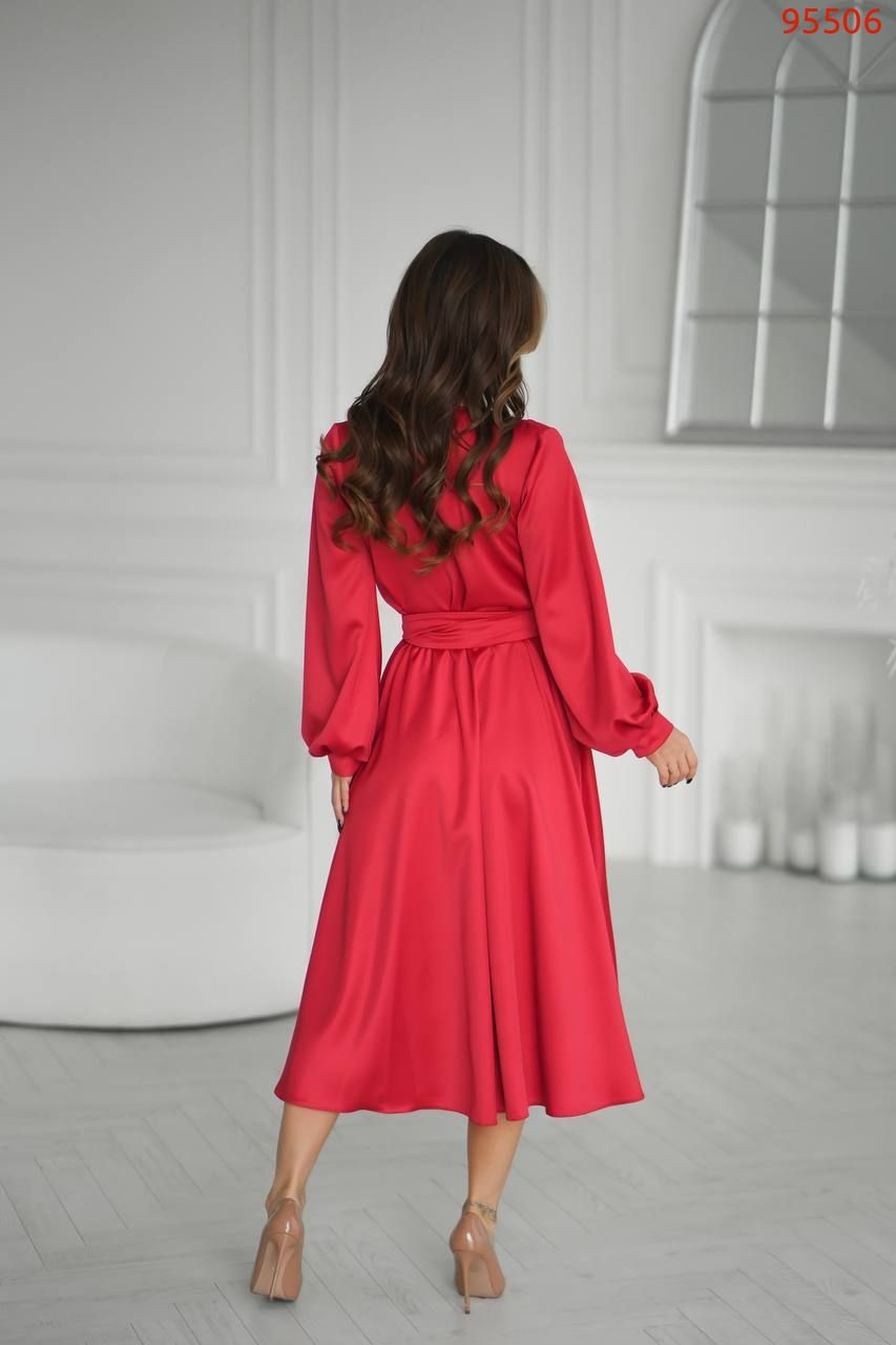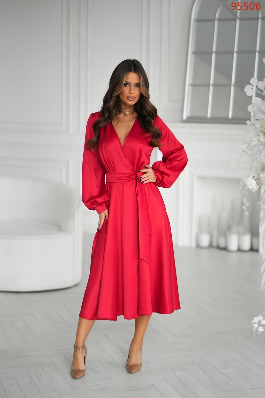 Довгі рукави з манжетами надають образу ніжності, а струмлива тканина красиво грає на світлі, створюючи ефект дорогоцінного шовку.