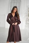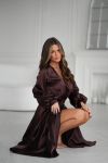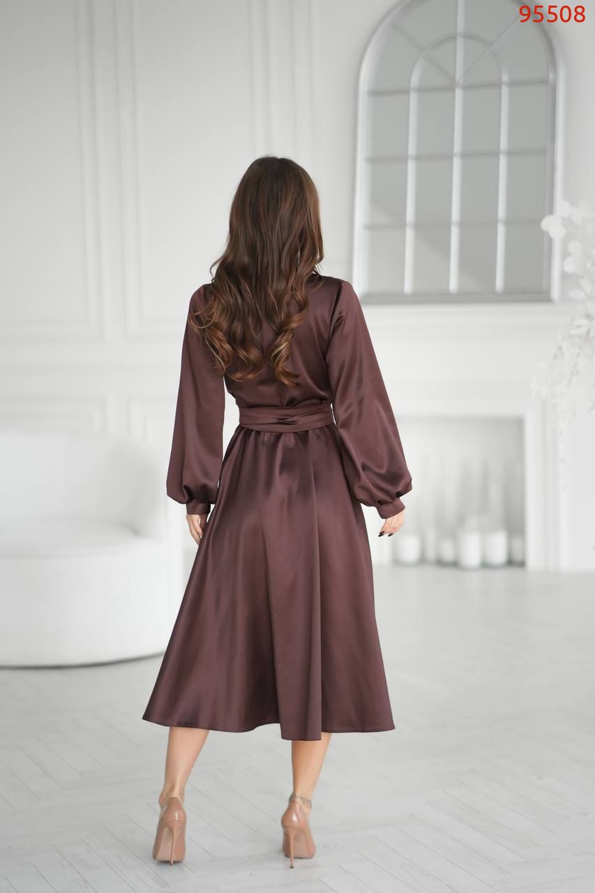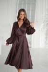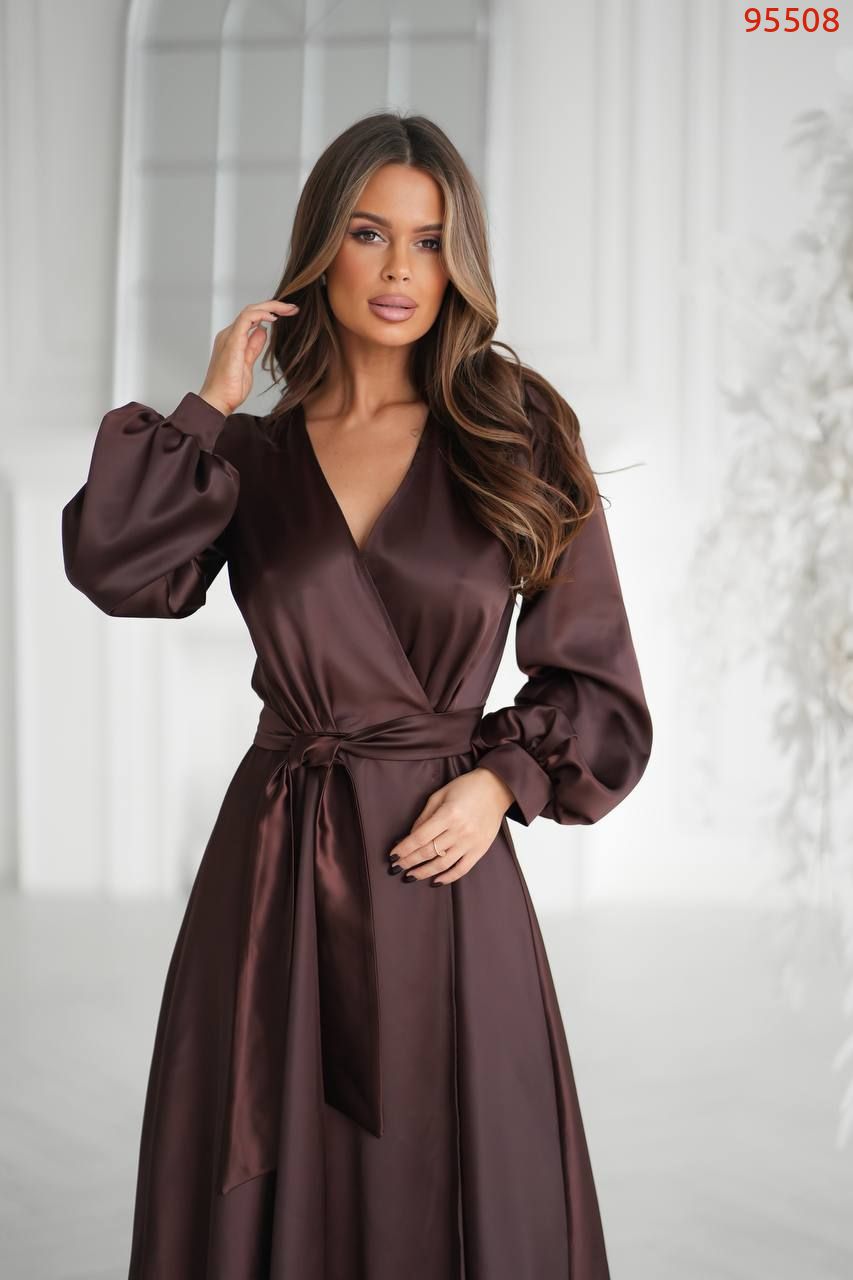 Довгі рукави з манжетами надають образу ніжності, а струмлива тканина красиво грає на світлі, створюючи ефект дорогоцінного шовку.
