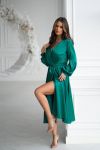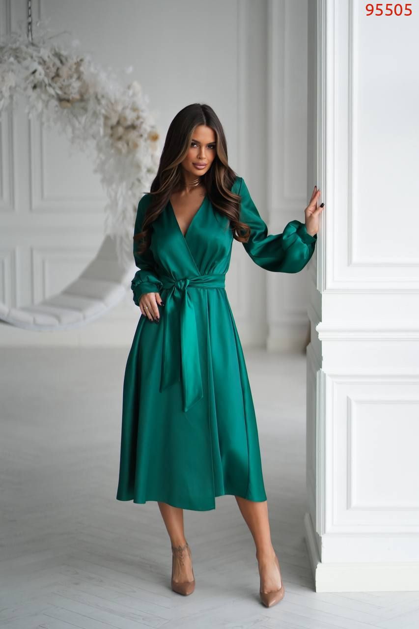 Довгі рукави з манжетами надають образу ніжності, а струмлива тканина красиво грає на світлі, створюючи ефект дорогоцінного шовку.