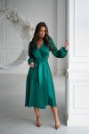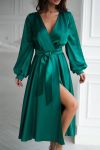 Глибоке V-подібне декольте в поєднанні із запахом м’яко акцентує лінію талії, а пояс додає силуету витонченості.
