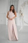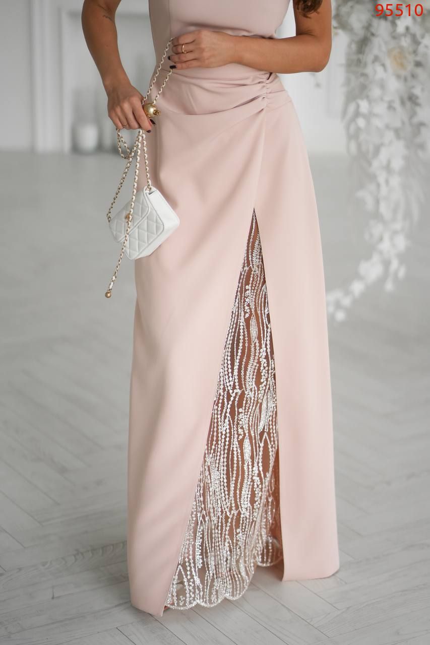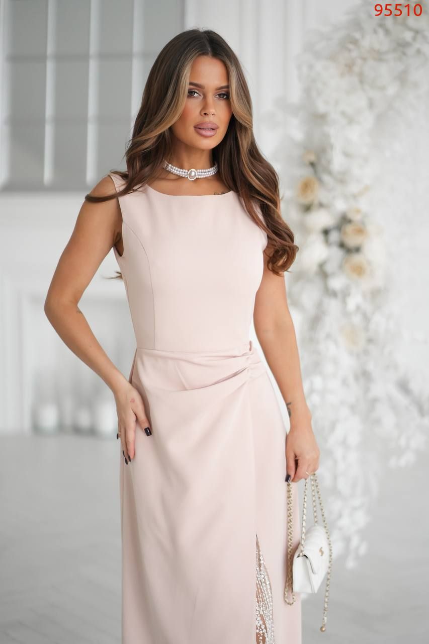 Має прямий силует, витончену драпіровку на талії та високий розріз, що додає образу жіночності й шарму.