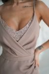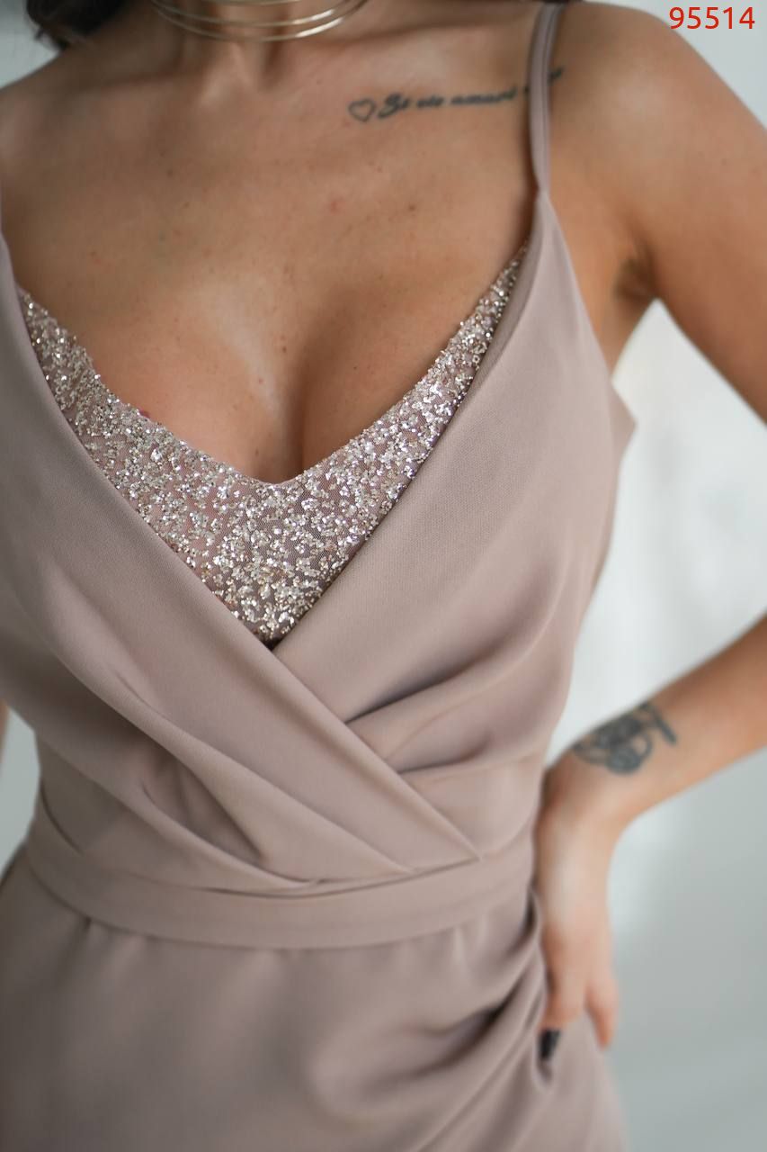 Верх моделі – на запах, м’яко підкреслює декольте, а глітерна мереживна вставка додає образу ефектного сяйва.