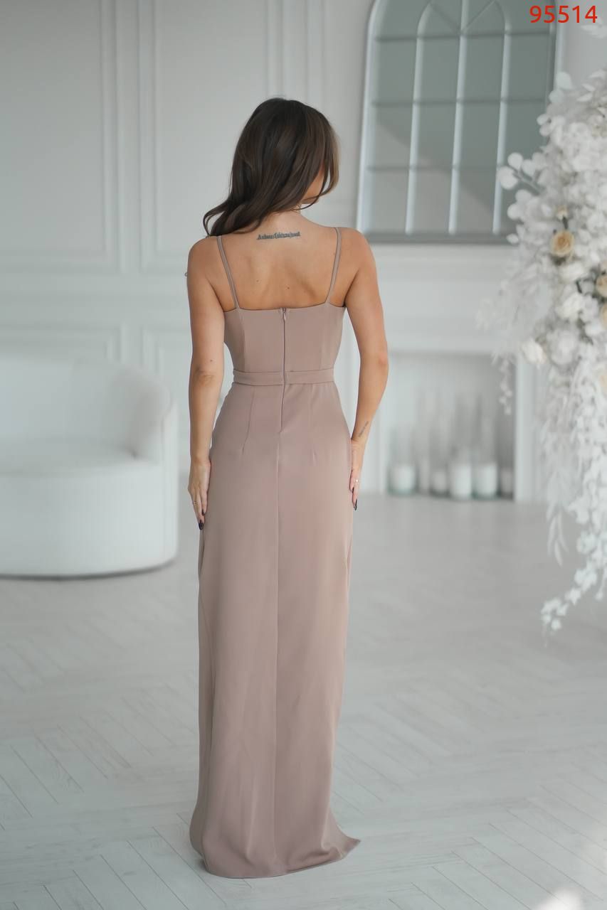 Драпіровка на талії формує витончений силует, а високий розріз спереду робить крок легким і впевненим.