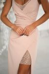 Верх моделі – на запах, м’яко підкреслює декольте, а глітерна мереживна вставка додає образу ефектного сяйва.