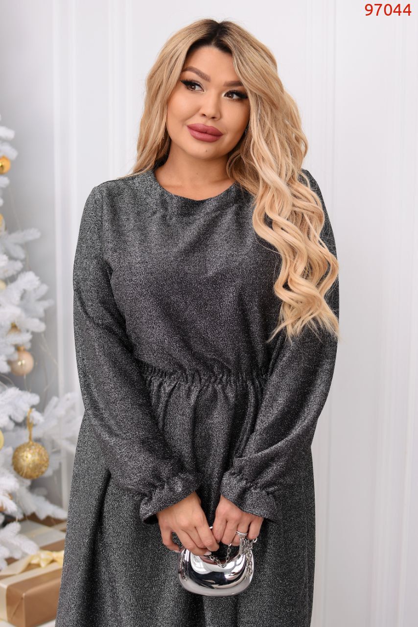 58-60 ОГ 116 см, талія не в розтягнутому стані 45 см, дл рукава 65 см, довжина сукні 103 см, бедра 140 см.