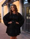 Сукня коротка, виконана з легкої, трохи блискучої тканини. Вільний фасон, з акцентом на талії завдяки поясу-стрічці. Довгі рукава, широкі, вільно спадають, надаючи образу романтичності та легкості. Зверху застібка на ґудзики спереду, що додає класичної нотки. Спідниця з двома ярусами воланів, які створюють об’єм та динаміку.