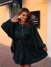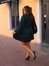Сукня коротка, виконана з легкої, трохи блискучої тканини. Вільний фасон, з акцентом на талії завдяки поясу-стрічці. Довгі рукава, широкі, вільно спадають, надаючи образу романтичності та легкості. Зверху застібка на ґудзики спереду, що додає класичної нотки. Спідниця з двома ярусами воланів, які створюють об’єм та динаміку.