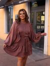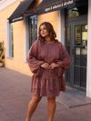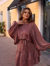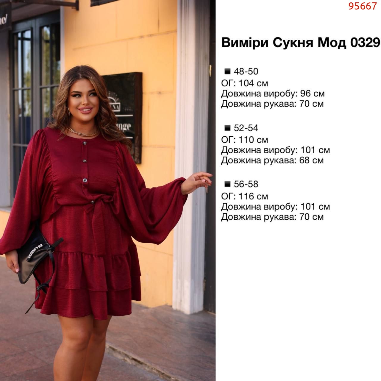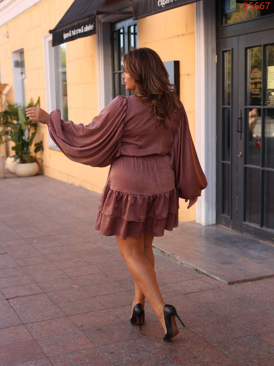 Сукня коротка, виконана з легкої, трохи блискучої тканини. Вільний фасон, з акцентом на талії завдяки поясу-стрічці. Довгі рукава, широкі, вільно спадають, надаючи образу романтичності та легкості. Зверху застібка на ґудзики спереду, що додає класичної нотки. Спідниця з двома ярусами воланів, які створюють об’єм та динаміку.