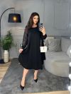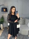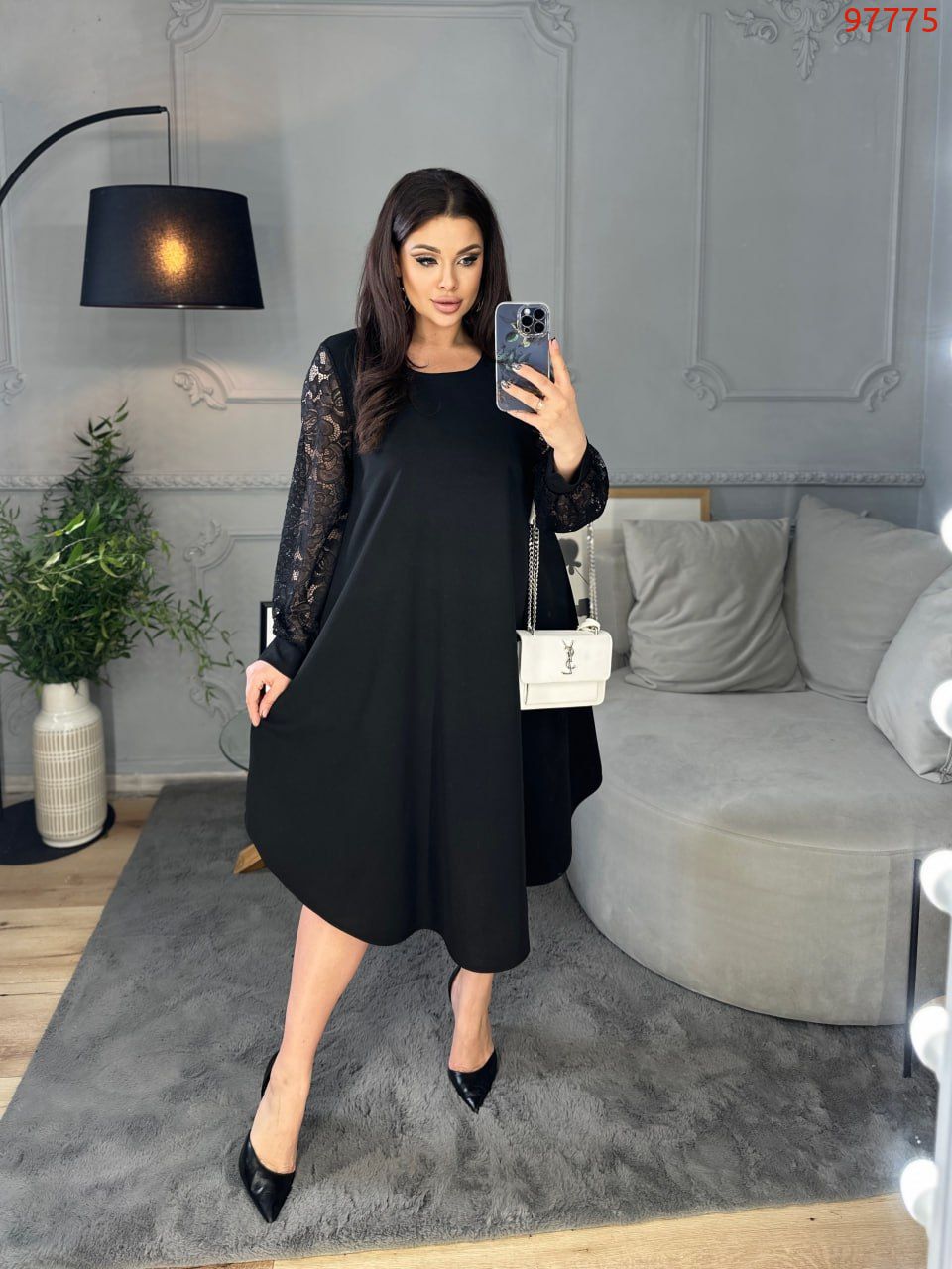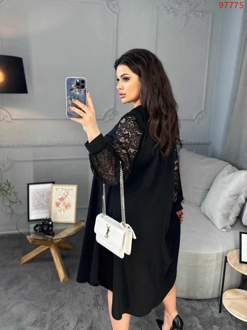 Силует сукні у вигляді трапеції, завдяки чому чудово маскує будь-які недоліки фігури та підкреслює її переваги. Виріз горловини круглий. Рукави на манжетах, виконані із гарного гіпюру в тон основної тканини. Низ сукні асиметричний. Застібок кишень немає.