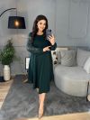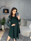 Силует сукні у вигляді трапеції, завдяки чому чудово маскує будь-які недоліки фігури та підкреслює її переваги. Виріз горловини круглий. Рукави на манжетах, виконані із гарного гіпюру в тон основної тканини. Низ сукні асиметричний. Застібок кишень немає.