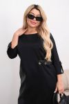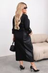 Плаття приталеного силуету , з боку вставка з екошкіри, яка подовжує та витягує візуально фігуру . По низу розріз , з боку на талії «хлястік» з ґудзиками , рукава нижче ліктя прикрашені ґудзиками та шкіряним патиком .