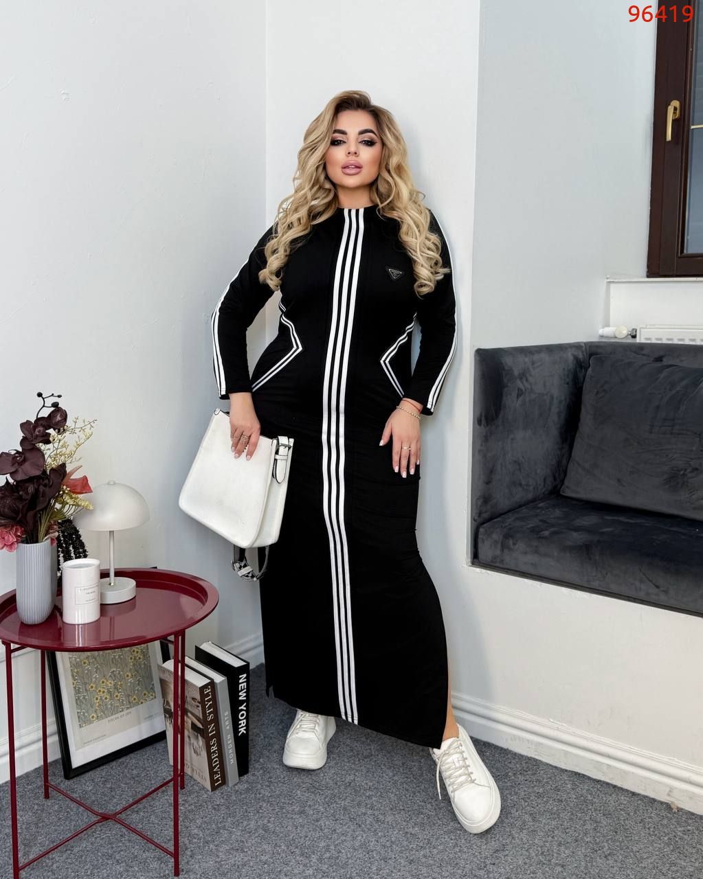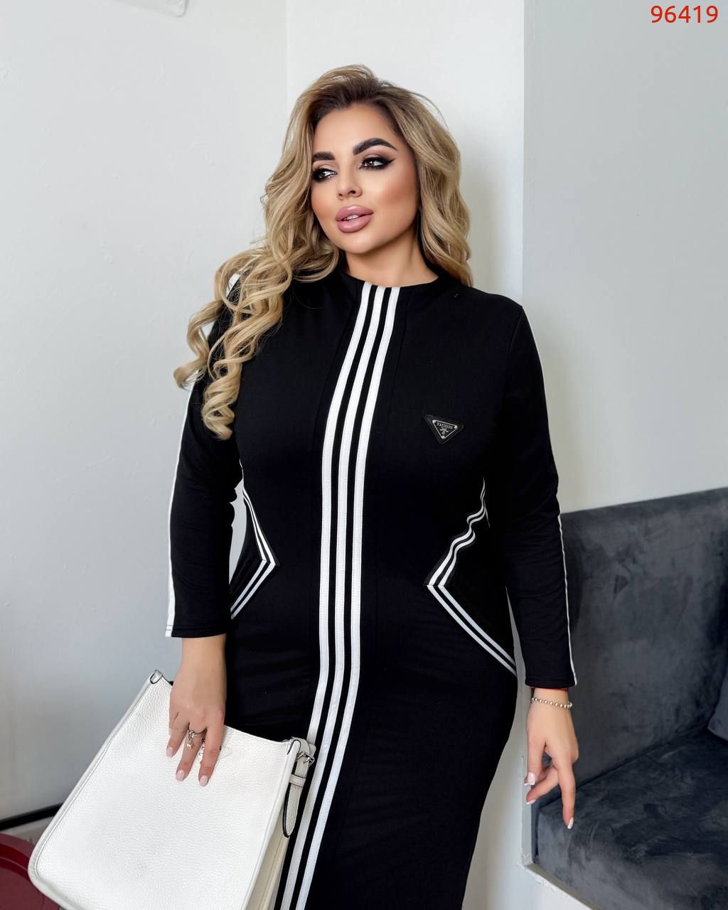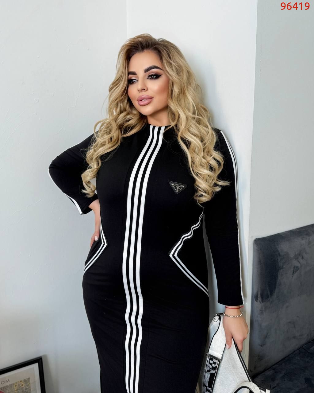 Плаття приталеного крою , прикрашене спереду лампасами в три ряди ( подовжує силует та робить фігуру більш витонченою ).