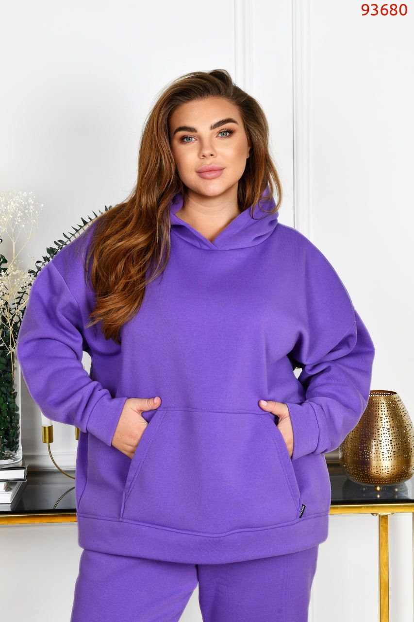 Худі з капюшоном, силует прямий вільний. Лінія плеча спущена. Рукави на манжетах. На передній полочці кишеня «кегуру».